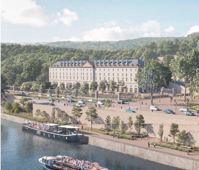 Deux vues d’artistes de l’entrée du musée du côté de Saint-Cloud par la place Clemenceau en 2027 © / DR