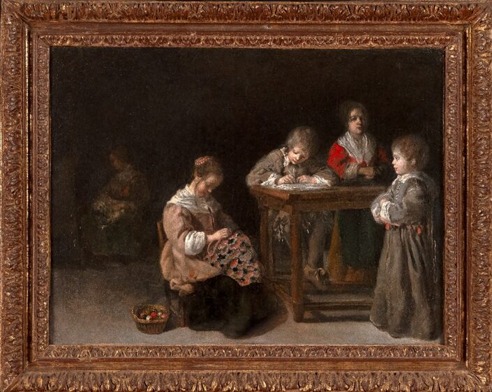 Entourage des frères Le Nain, Les Enfants à leur ouvrage, vers 1645, huile sur toile, cadre en bois sculpté et doré du XVIIe siècle, H. 35 x L. 45 cm, Département des Hauts-de-Seine, musée du Grand Siècle, inv. 2021.7.1 © CD92 / Willy Labre