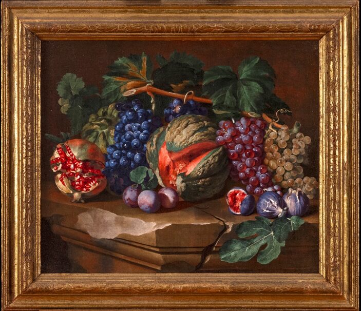 Reynaud Levieux, Nature morte au melon, à la grenade, raisins et figues, vers 1670 ?, huile sur toile, cadre sculpté et doré du XVIIe siècle, H. 51 x L. 62 cm, Département des Hauts-de-Seine, musée du Grand Siècle, don de la Société des amis du musée du Grand Siècle, inv. 2022.9.1 © CD92 / Julien Garraud