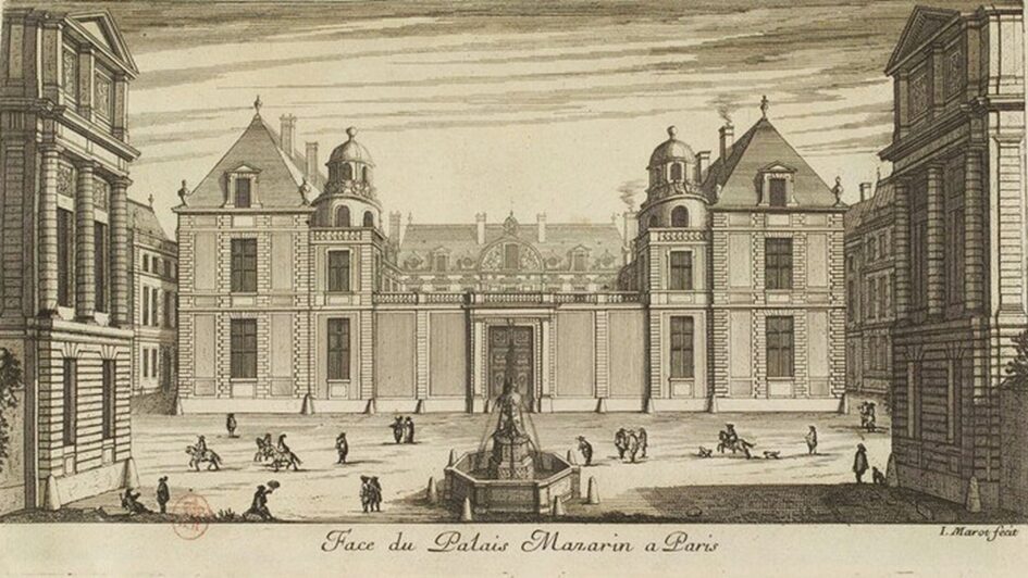 Né en 1602, d’une famille d’origine sicilienne, Giulio Mazzarini commence sa carrière à Rome, avant de devenir nonce apostolique en France en 1634-1636. Il passe finalement au service de la Couronne en 1639, avec l’appui du cardinal de Richelieu, qui avait repéré en lui un diplomate de grand talent et qui le recommande en mourant à Louis XIII. Jules Mazarin devient alors principal ministre de la reine régente, Anne d’Autriche, et le parrain, au double sens du terme, du jeune Louis XIV. Habilement, le cardinal-ministre a choisi de se faire aménager une demeure dans le quartier neuf des Fossés-Jaunes, derrière le Palais-Royal où la reine régente s’est établie en octobre 1643. Il investit pour cela un hôtel rue neuve des Petits-Champs : élevée entre cour et jardin, la demeure a été bâtie en 1635 dans un goût traditionnel, avec des façades en brique et pierre (fig. 1). Mazarin y fait travailler dès 1644 l’architecte François Mansart (1598-1666), qui conduit une première campagne de transformations : création d’un nouvel escalier d’honneur, redistribution des appartements du corps de logis, enfin édification d’une grande aile sur jardin, destinée à abriter deux galeries superposées pour les collections de Mazarin. Pour le décor intérieur, en revanche, le cardinal souhaite faire venir des artistes italiens dont il apprécie le style et la manière démonstrative. Après le refus de Pierre de Cortone, il convainc un de ses élèves, le bolonais Romanelli, de faire le voyage en France.