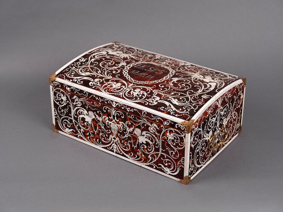 Vers 1650-1660Bois de cèdre et ébène, marqueterie d’écaille de tortue, nacre et ivoire, ferrures et poignées de métal doré.Signé sur le dessus « J. Harmens »H. 21,5 cm x L. 50 cm. x P. 34 cmInv. 2022.5.1