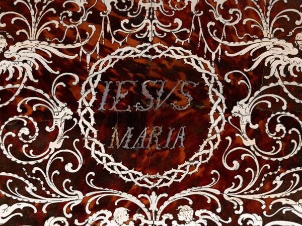 Ce coffret au décor composé de matières précieuses présente au centre du couvercle un motif de couronne d’épines et l’inscription « IESVS MARIA ». Il s’agit de l’emblème de la Société de l’Oratoire de Jésus et de Marie, dite Oratoire de France. Cette congrégation a été fondée en 1611 par Pierre de Bérulle (1575-1629), représentant majeur de l’Ecole française de spiritualité. L’Oratoire de France est une société de vie apostolique, vouée à l’enseignement et à la formation du clergé. Il a d’abord pour mission de former les clercs à une vie de piété, aux lettres et aux sciences.