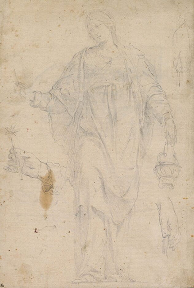 Fig. 3 : Jean Daret, Sainte debout tenant un bénitier et un goupillon, pierre noire sur papier, H 26,2 x L. 17,8 cm, Département des Hauts-de-Seine, donation Pierre Rosenberg, musée du Grand Siècle, 7765 © CD92 / MGS