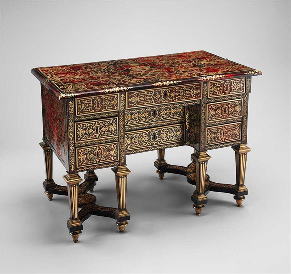 La « marqueterie Boulle » associe l’écaille de tortue, que nous voyons ici rouge et brune, et le laiton (alliage de cuivre et de zinc). Pour la réaliser, on superpose la feuille d’écaille de tortue et la feuille de laiton et on appose sur celles-ci un dessin. On incise alors les feuilles en suivant les lignes du dessin pour obtenir simultanément deux fois le même motif : une fois sur la feuille d’écaille et une fois sur la feuille de laiton. On peut alors associer le motif en laiton au fond en écaille (« première partie ») et le motif en écaille au fond en laiton (« contre-partie »). Ici, nous avons la « première partie » puisque le motif est en laiton et le fond en écaille.