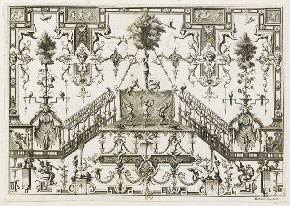 Le décor de grotesques de notre écritoire est donc probablement inspiré de dessins de Jean Berain. Cet artiste a contribué à leur redonner une place dans les arts décoratifs, notamment en diffusant ses modèles par la gravure. Les grotesques sont des motifs décoratifs antiques redécouverts à la Renaissance figurant des corps à la fois humains et animaux se terminant en rinceaux et autres motifs végétaux stylisés.