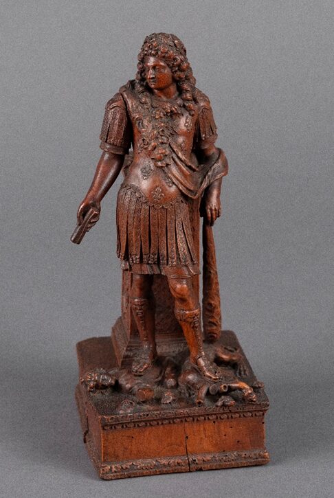 1687Bois de Sainte-Lucie (merisier)Signé et daté en-dessous R. MESNY NANCEIANUS / FECIT 1687La plinthe inscrite (R)ENDRE A TA FO(I) / (S)ON LUSTRE et VAINCRE (T)ES / ENNEMI(S)Le piédestal inscrit HIC/LUST/TRAT, LOUIS LE GRAND / ROI DE FRANCE / ET DE NAVARRE / XIV DE CE NOM, et INC/VIN/CITH. 24,5 cmInv. 2023.3.1