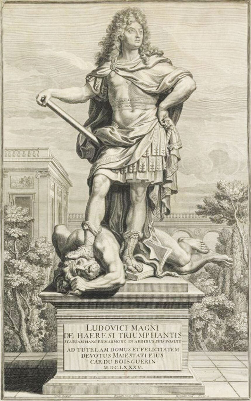 Ainsi, quelques années auparavant, Gilles Guérin avait représenté Louis XIV vainqueur de la Fronde, autre moment de rébellion contre l’autorité royale, dans la cour de l’Hôtel de Ville de Paris (Chantilly, musée Condé, inv. OA 4239) : le jeune souverain y écrase un soldat vaincu courbé à ses pieds. Ce type de représentation agressive se multiplie avec la révocation de l’Edit de Nantes : Martin Desjardins l’illustre ainsi en bronze place des Victoires en 1686 (statue détruite en 1792), où le roi en habit de sacre écrase l’hydre.
