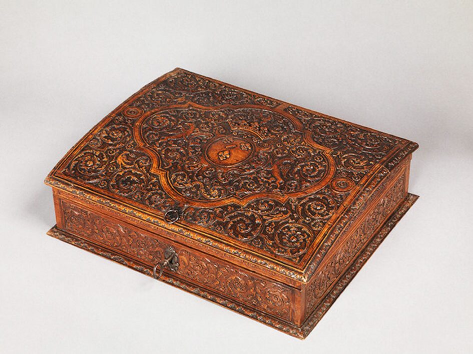 Atelier lorrain, Écritoire aux armes de Louis-Bénédicte de Bourbon-Condé, duchesse du Maine, vers 1700, bois de Sainte-Lucie, H. 10 x L. 33,5 x P. 27 cm, Sceaux, Château de Sceaux, domaine départemental, inv. 2015.1.1 © CD92 / Philippe Fuzeau