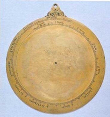 Ce lunarium est d’ailleurs le seul connu entièrement réalisé en métal. Les deux exemplaires repérés sont en carton aquarellé (Cambridge University, Whipple Museum) et en carton, papier, bois et laiton (Chicago, Adler Planétarium).
