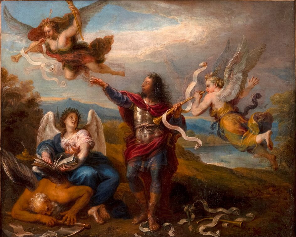 Le modello présente ainsi le prince de Condé, vêtu à la manière d’un chef de guerre romain, qui retient de la main gauche la trompette de la renommée qui allait proclamer ses victoires au service de l’Espagne contre la France. Dans la version définitive de la toile du château de Chantilly, on peut lire sur le phylactère, sorte de petite banderole blanche sur laquelle sont inscrites les paroles en latin du personnage central, « Sileat », c’est-à-dire « qu’elle se taise ».