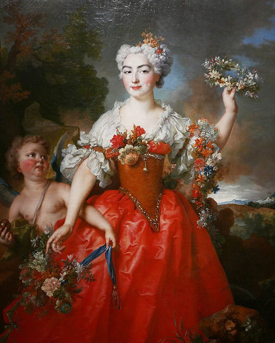 Nicolas de Largillierre se spécialise notamment dans les portraits mythologiques, dans lesquels il peint trait pour trait son modèle mais avec les attributs d’un dieu, d’une déesse ou d’un héros mythologique. C’est le cas par exemple de Madame de Gueidan, épouse du président du Parlement de Provence, peinte en Flore (Fig. 3).