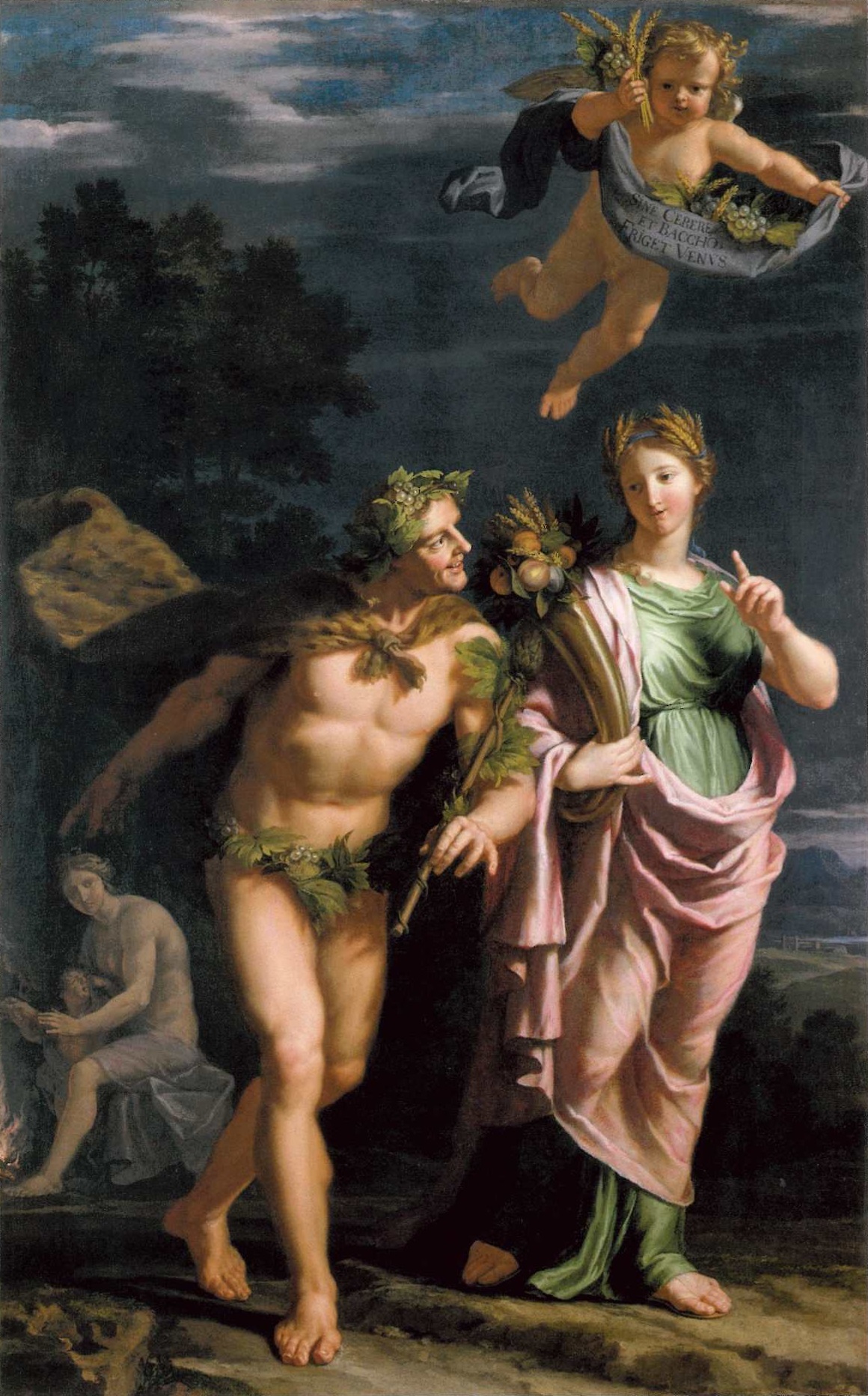 La bouche entrouverte, l’index levé, indiquent bien la prise de parole de Cérès, ce que confirme la banderole azurée tenue par l’angelot au-dessus de la déesse sur laquelle se détache le proverbe de Térence. Le bien-fondé de l’adage est subtilement renforcé par la présence de pêches à feuilles dans la corne d’abondance de la déesse, symboles de vérité par analogie avec un cœur (vérité) surmonté d’une langue (parole), comme le veulent les Hieroglyphica de Pierio Valeriano (1556), reprises par Cesare Ripa (1593). Au fond se tient au coin d’un feu manifestement poussif, sous un toit de chaume, Vénus, qui regarde avec tristesse s’éloigner les deux dieux sans lesquels elle a froid. Même si Cupidon semble bien s’en plaindre, il n’est pas dit que Jean-Baptiste de Champaigne, en bon disciple de l’austère Grand Arnauld – parrain de sa fille –, ait évacué le sens moral de son œuvre, car si la lumière, extérieure au tableau, fait irruption sur Cérès et Bacchus, elle accentue fortement le caractère crépusculaire du second plan et contribue à donner à la scène une indéniable tonalité dramatique.