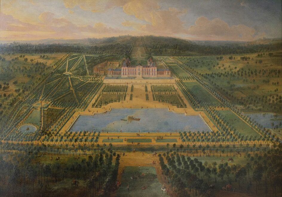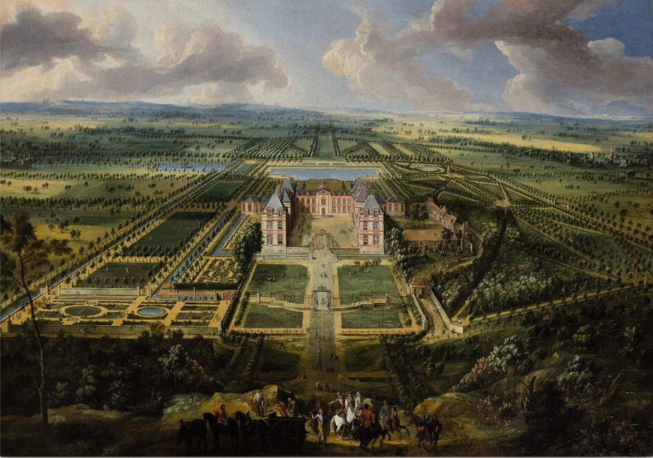 Chacune des toiles présente une maîtrise des règles topographiques. La composition est centrée de manière verticale et horizontale, avec une différence cependant : le corps principal du château occupe le centre de la vue orientée vers l’ouest, alors que c’est le grand bassin en forme de T, qui tient cette place centrale dans la vue orientée vers l’est. L’harmonie du dessin d’ensemble valorise la symétrie dominant dans les plans du château et dans l’ordonnancement des espaces environnants. Une puissante perspective sur l’axe est-ouest déploie des allées perpendiculaires, parallèles ou obliques. Les bâtiments du corps de logis en forme de « U » ainsi que les petites ailes latérales font apparaître des panneaux de briques sertis dans un appareil de pierres blanches, suggérant des analogies avec le château royal de Saint-Germain. Le Nôtre a souhaité magnifier le château en allongeant les effets de perspective et en exploitant les jeux d’optique.