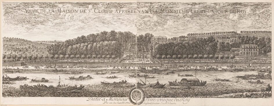 La fondation du château de Saint-Cloud remonte à la fin du XVIe siècle, lorsque Jérôme de Gondi, proche de la reine Catherine de Médicis qui lui a offert le terrain, fait bâtir une villa entourée d’un grand jardin. Dominant la Seine, ce premier édifice offrait une villégiature de qualité, avec des vues lointaines jusqu’à Paris. Le domaine passe en 1655 au banquier Barthélémy Hervart, qui fait agrandir et embellir les jardins. L’ensemble est finalement acquis en 1658 par Philippe d’Orléans (1640-1701), frère du Roi, appelé « Monsieur », dont le rang commandait la possession d’un grand domaine en Ile-de-France.
