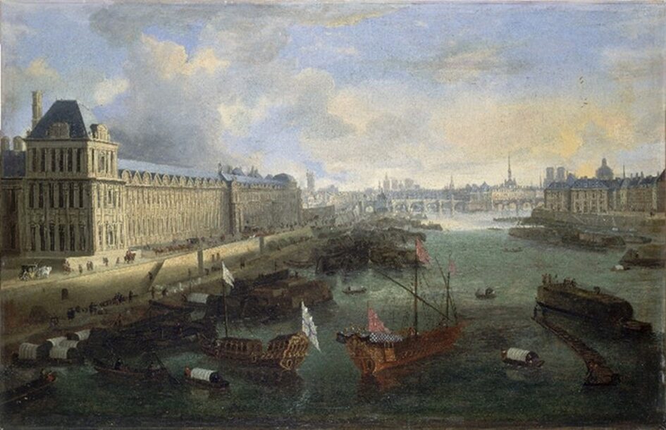 Grâce à l’attention portée aux détails par l’artiste, on reconnaît sur la Seine des types d’embarcations connus et, surtout, une galère rouge. Absente de la gravure d’Israël Silvestre, celle-ci se retrouve sur d’autres tableaux contemporains : on la voit notamment sur une vue anonyme montrant La Grande Galerie du Louvre, le Pont Neuf, la Cité et le collège des Quatre-Nations, connue par plusieurs versions, dont l’une est conservée au musée Carnavalet à Paris (Fig. 4).