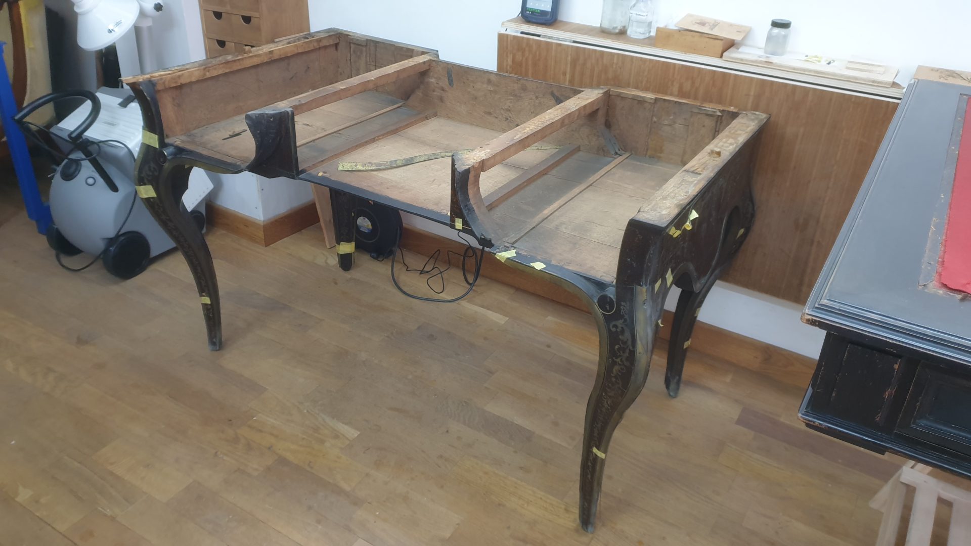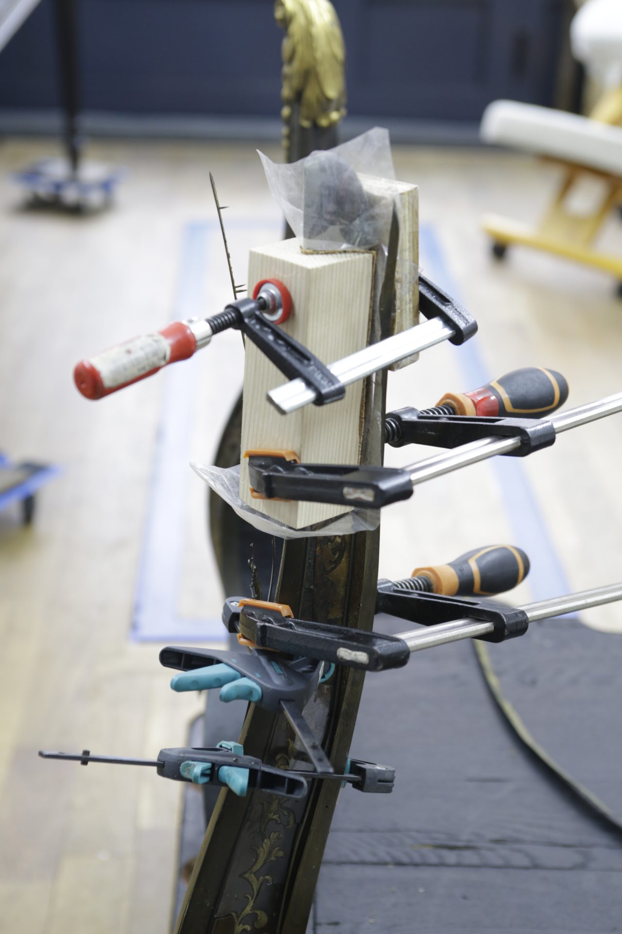 Afin de refixer le pied arrière gauche, une partie de marqueterie a été démontée afin de pouvoir accéder à la cassure. Le pied a été recollé à l’aide de colle de poisson chargée de sciure de chêne et serré à l’aide de calles en forme. Plusieurs desserrages ont été nécessaires pour nettoyer les débords de colle.