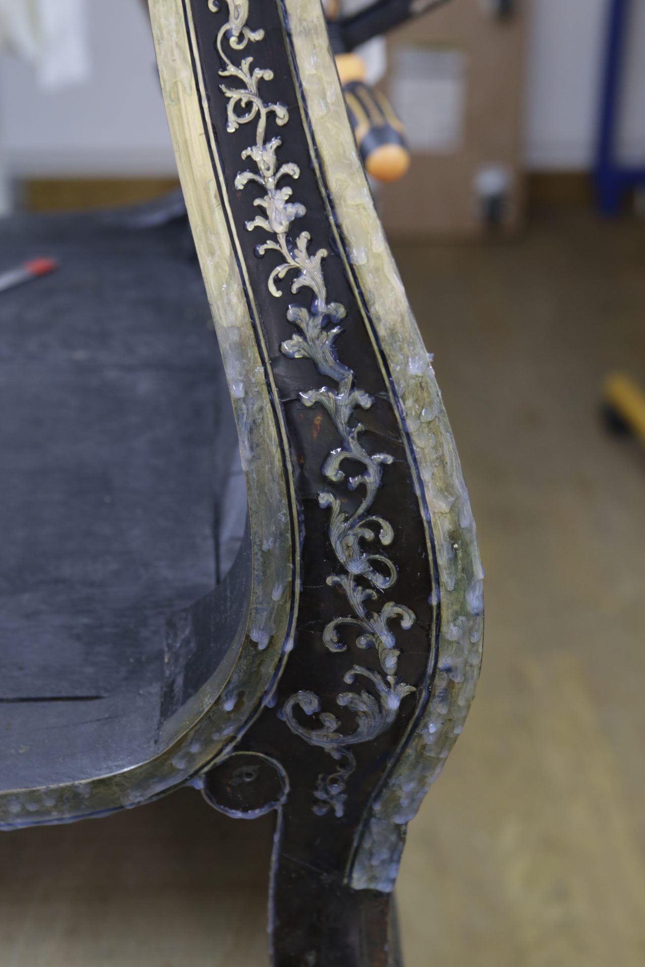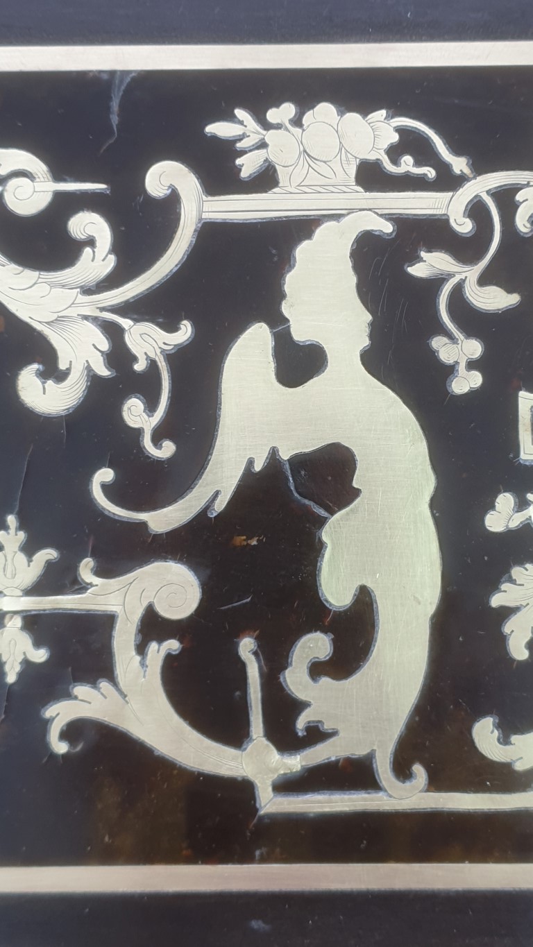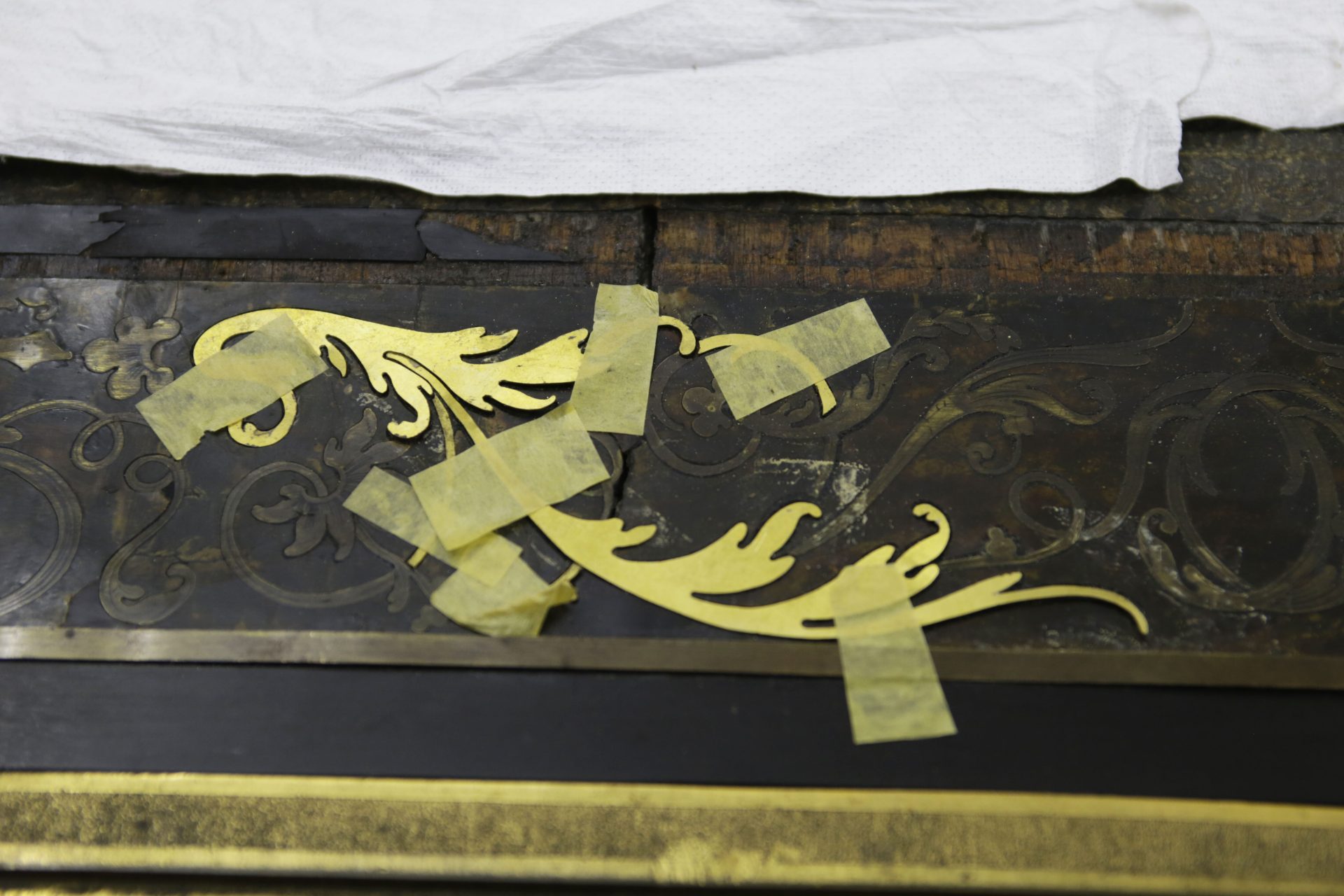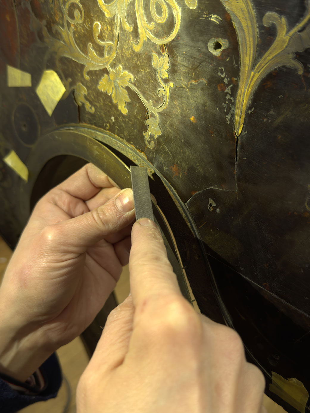 Les lacunes ont également été comblées avec des pièces d’ébène, de laiton et d’écaille de tortue (dont il restait des chutes d’une restauration précédente). Le laiton neuf a été ensuite gravé au burin, à l’imitation des pièces d’origine, à l’exception des ombrages, afin que la restauration reste lisible. Pour les lacunes d’écailles, les manques les plus petits ont été comblés avec de la cire-résine teintée.