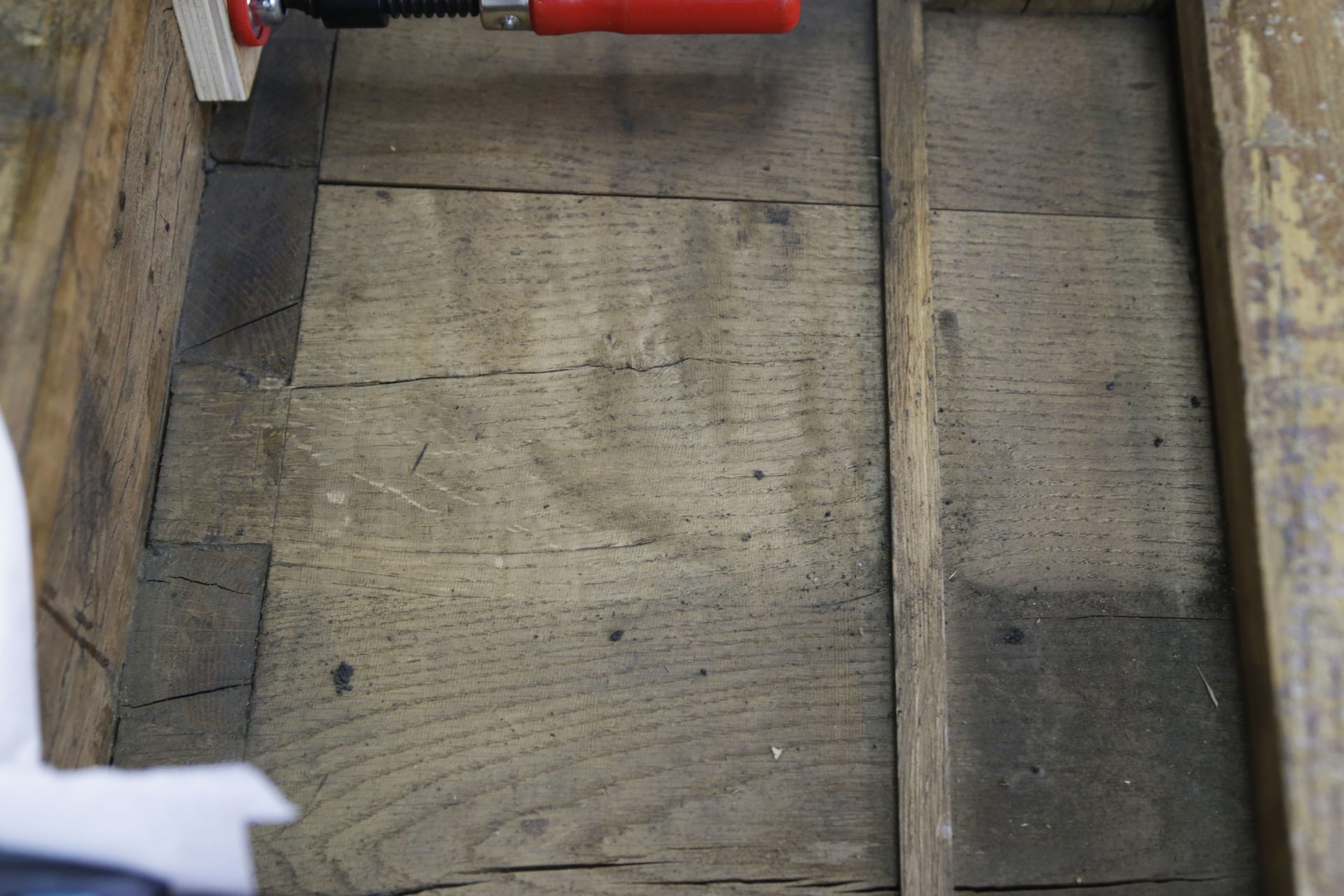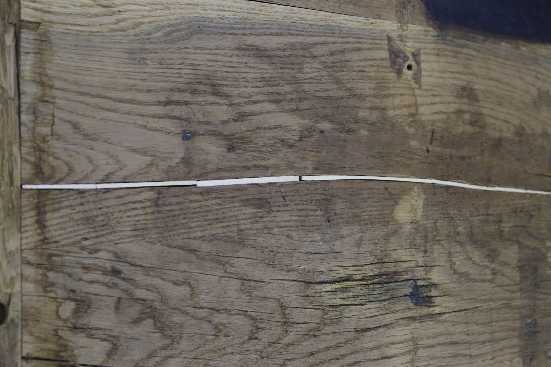 La fente du plateau a été stabilisée grâce à des flipots, c’est-à-dire des pièces rapportées dans le plateau pour combler la fente. Les restauratrices ont retenu des flipots de tilleul, dont la densité, plus faible que celle du bâti en chêne, évite de contraindre le bois. Le plateau a ensuite été refixé au bureau à l’aide de colle de poisson. Le serrage a été maintenu durant 48h afin d’être assuré d’un séchage complet.