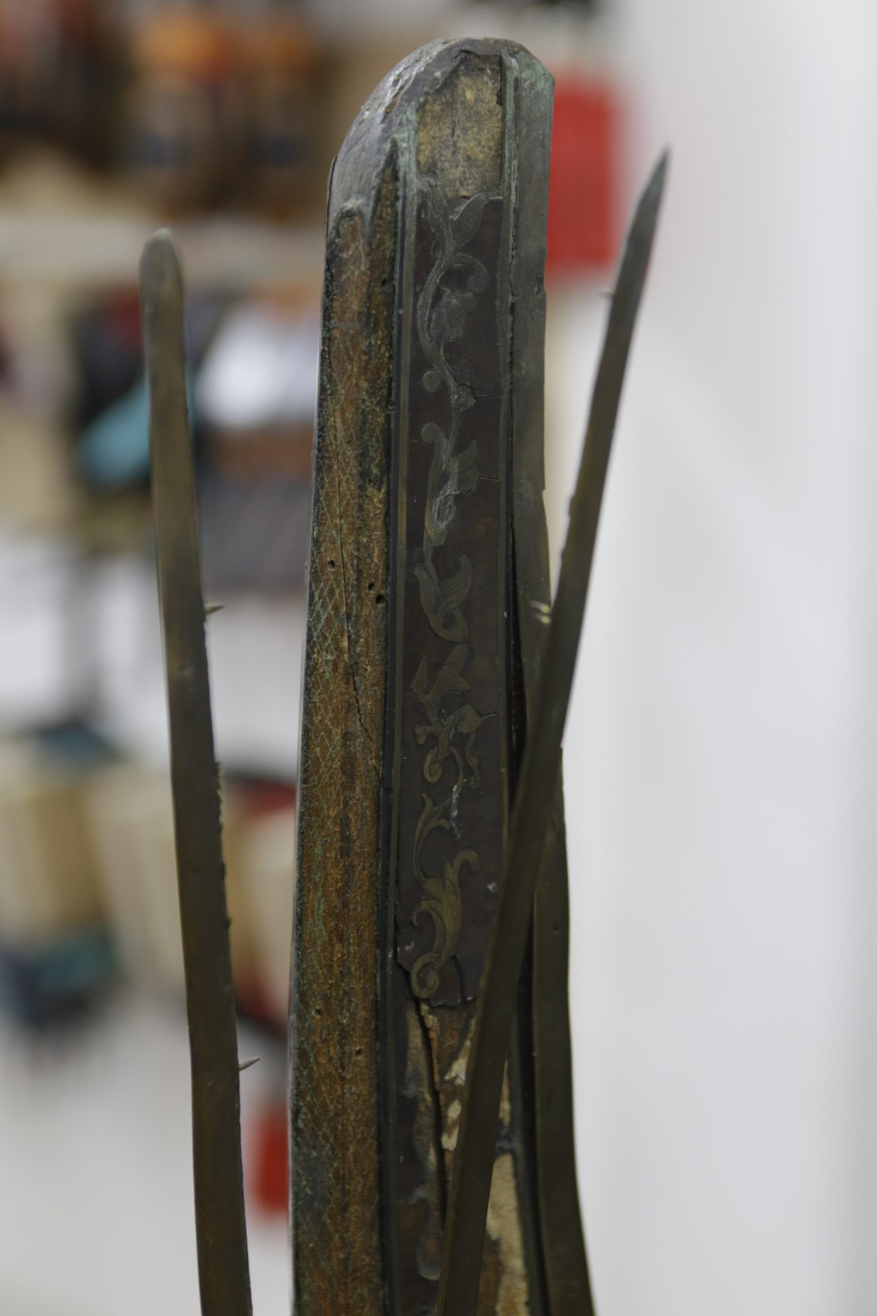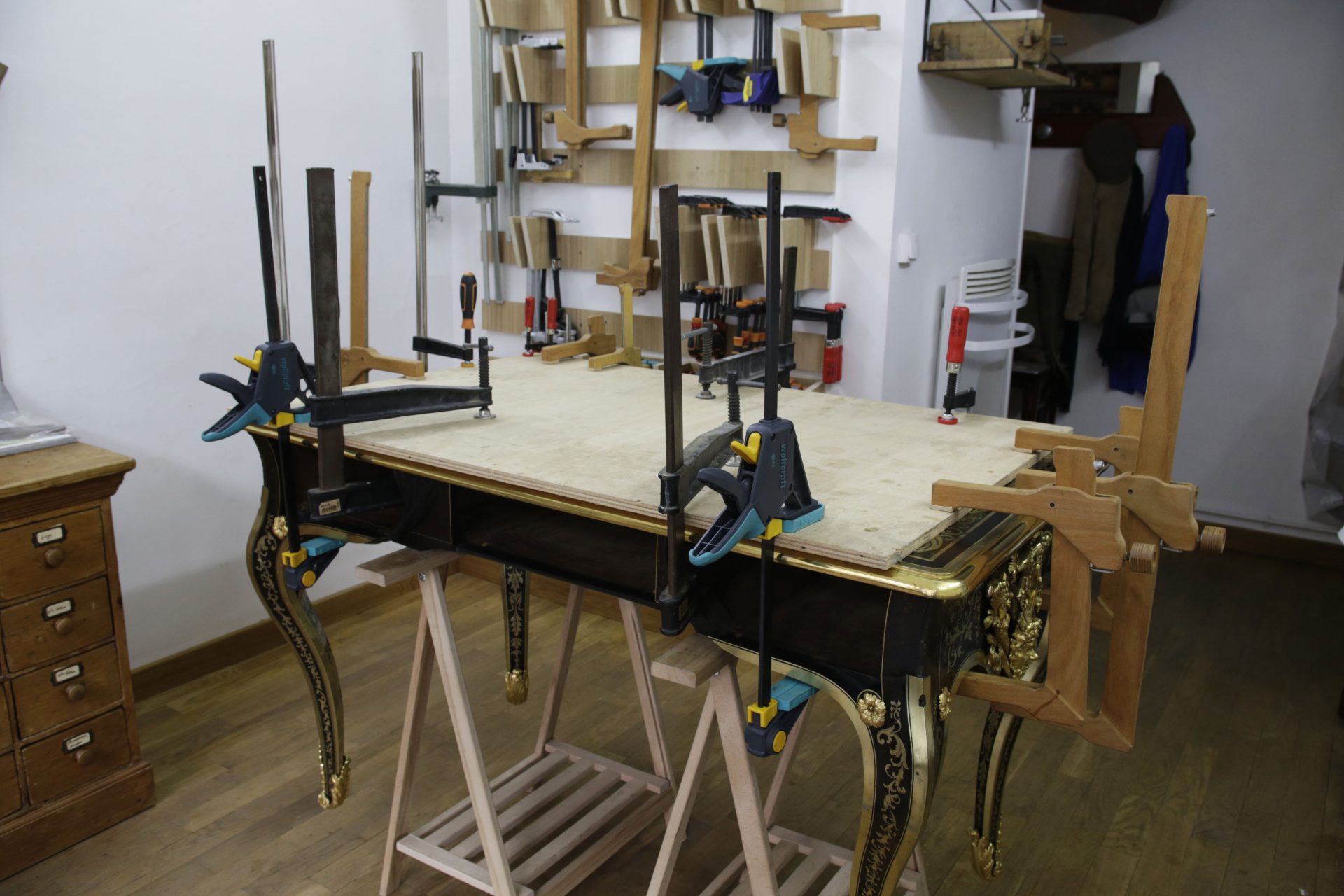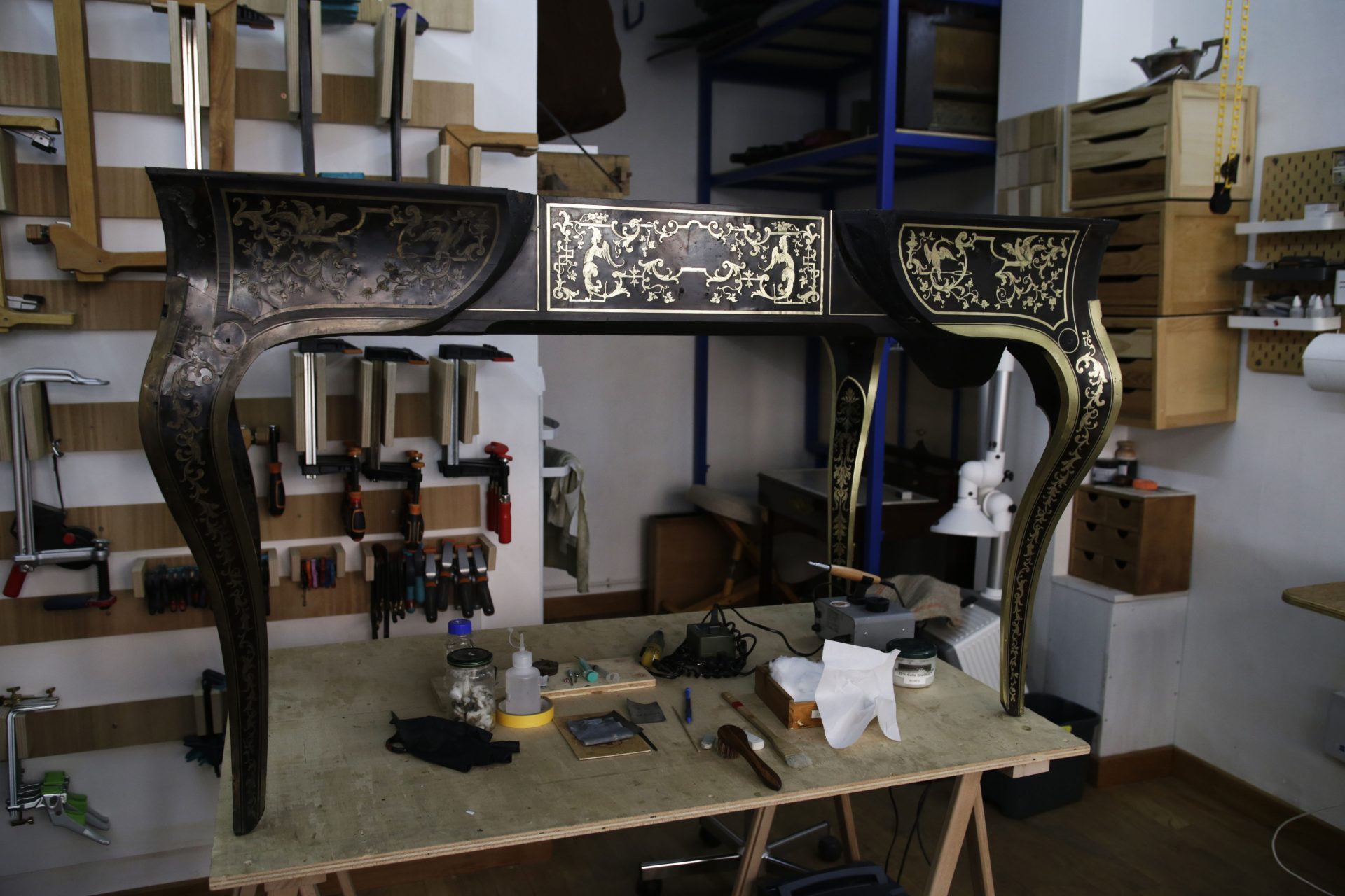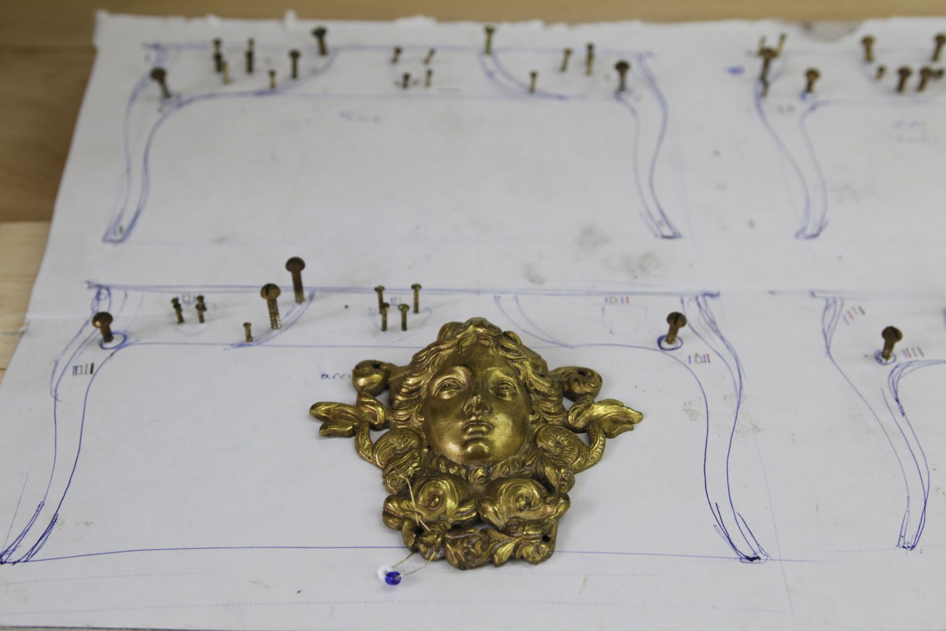 De nombreux éléments soulevés étaient déformés et ne pouvaient plus s’imbriquer dans les emplacements dédiés. Afin de les remboîter, les restauratrices ont dû éliminer certains joints de colle et, parfois, limer les pièces en écaille de tortue et en laiton. Un travail de frappe a permis de rendre à certaines pièces métalliques leurs formes originelles. Les pièces ont ensuite été fixées par collage.