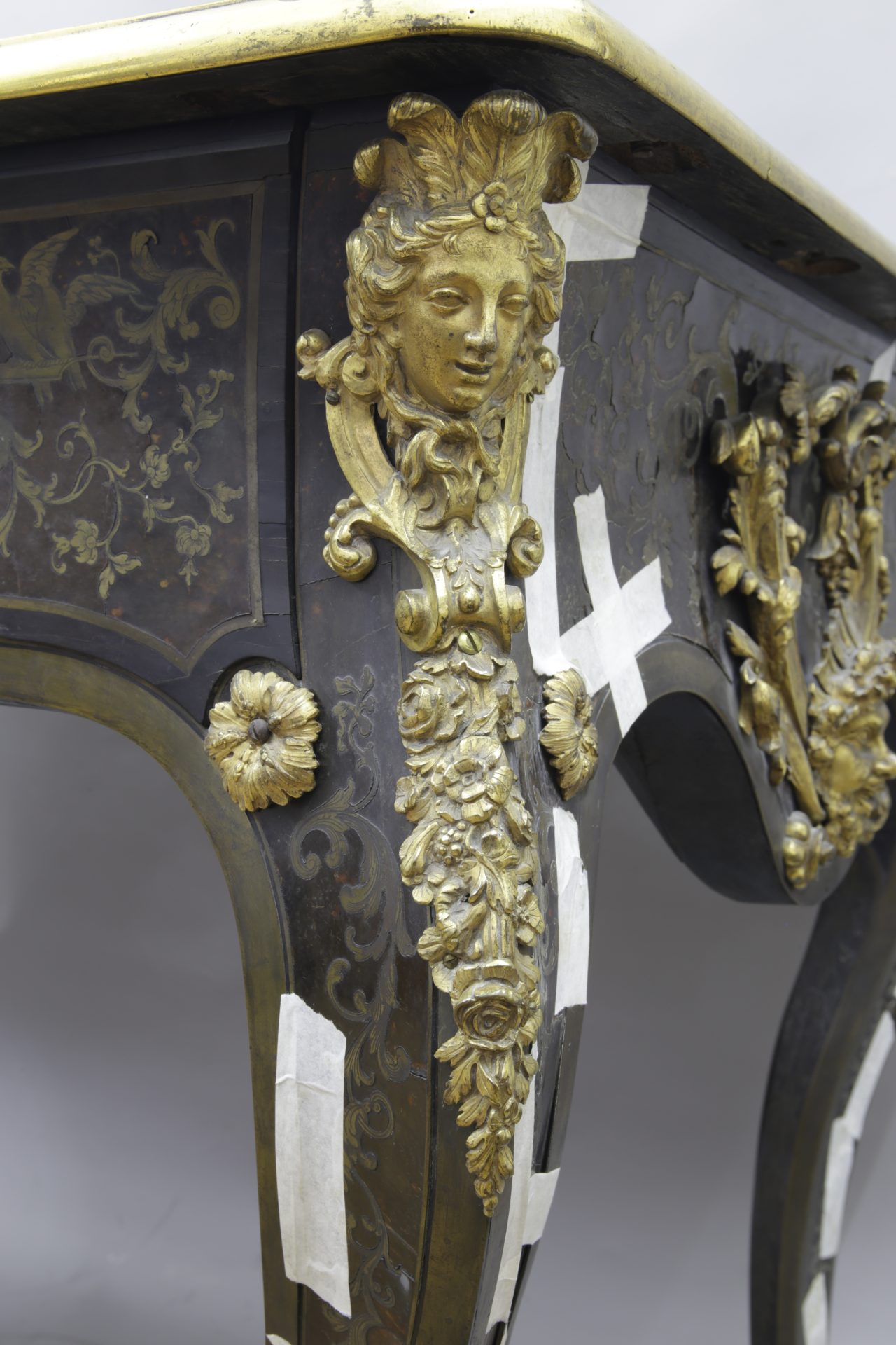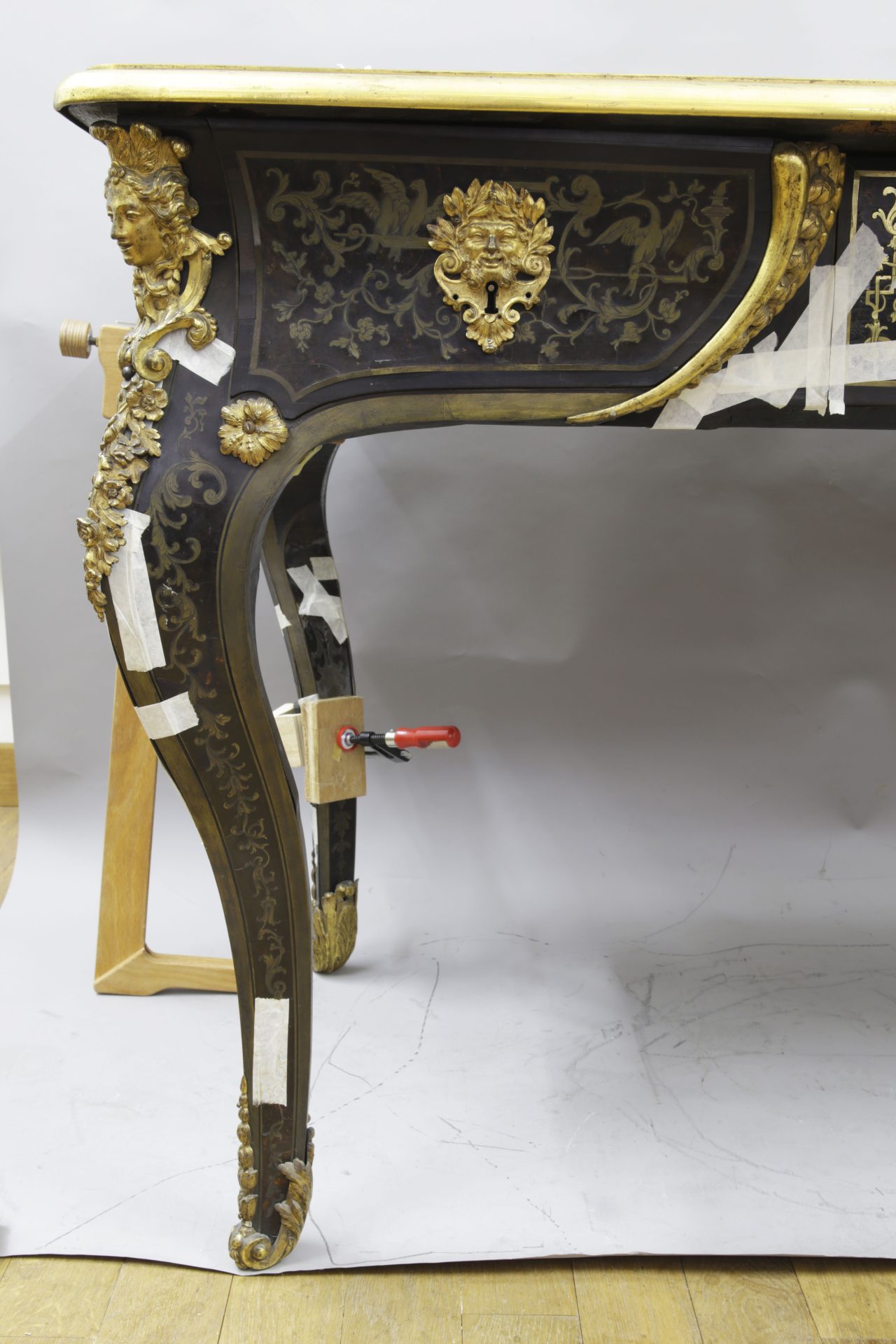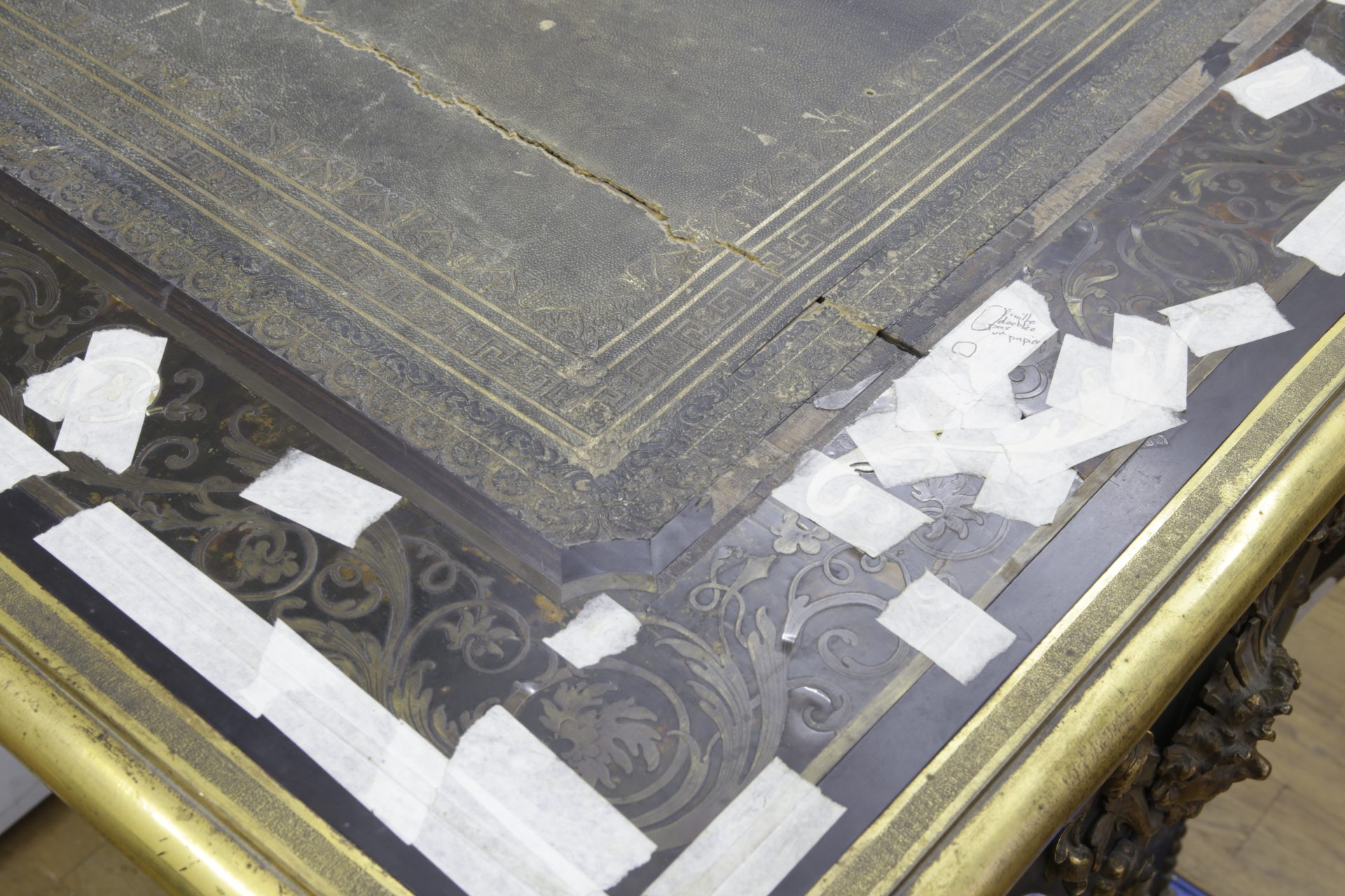 Attribué à Bernard Ier Van Riesen Burgh (1670-1738)Bâti en bois, marqueterie de bois d’ébène, écaille, laiton, cuir et bronzes dorés.Vers 1710-1715H. 81 cm ; L. 133 cm ; P. 91 cmInv. GR 813, dépôt du Musée des Arts décoratifs de Paris