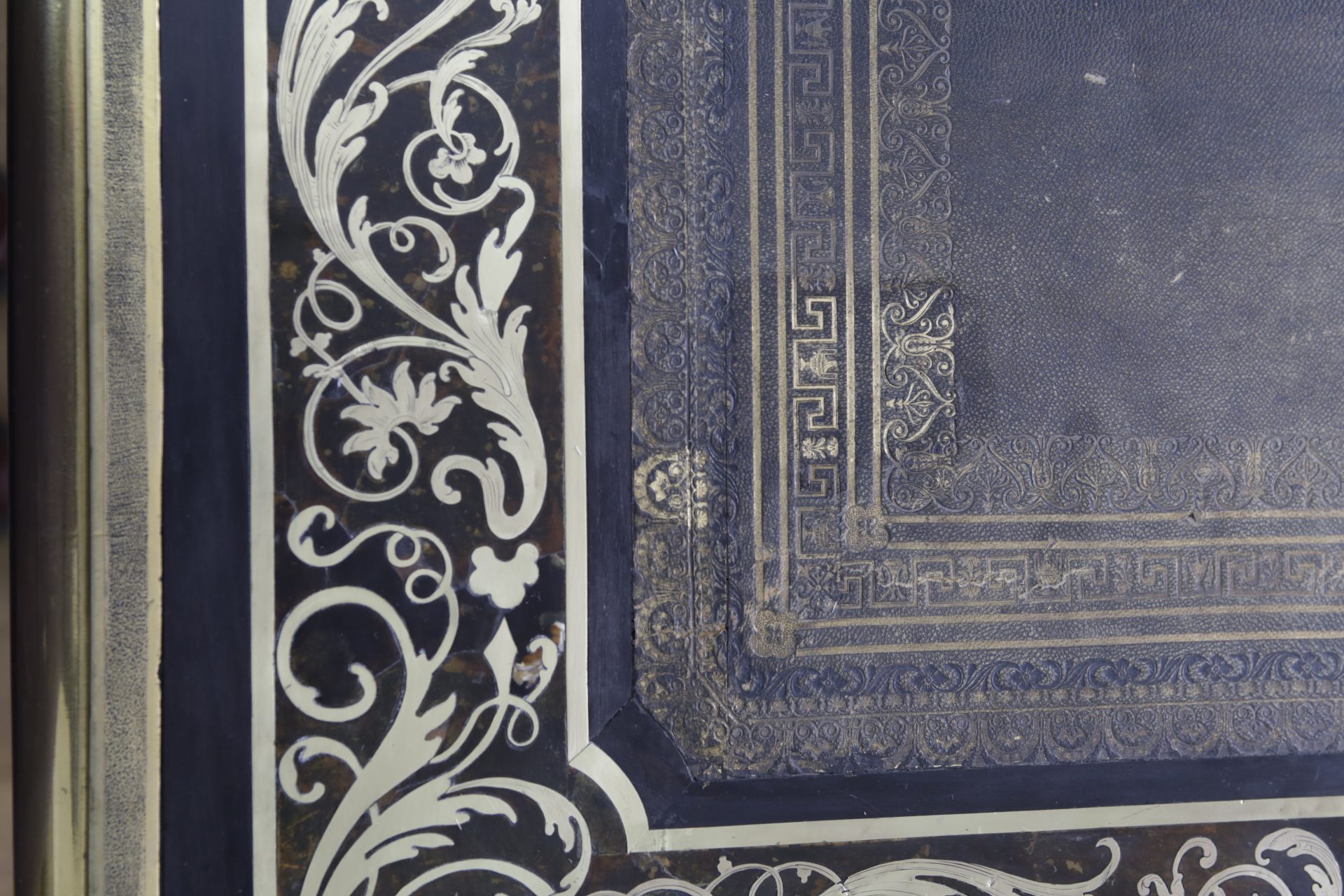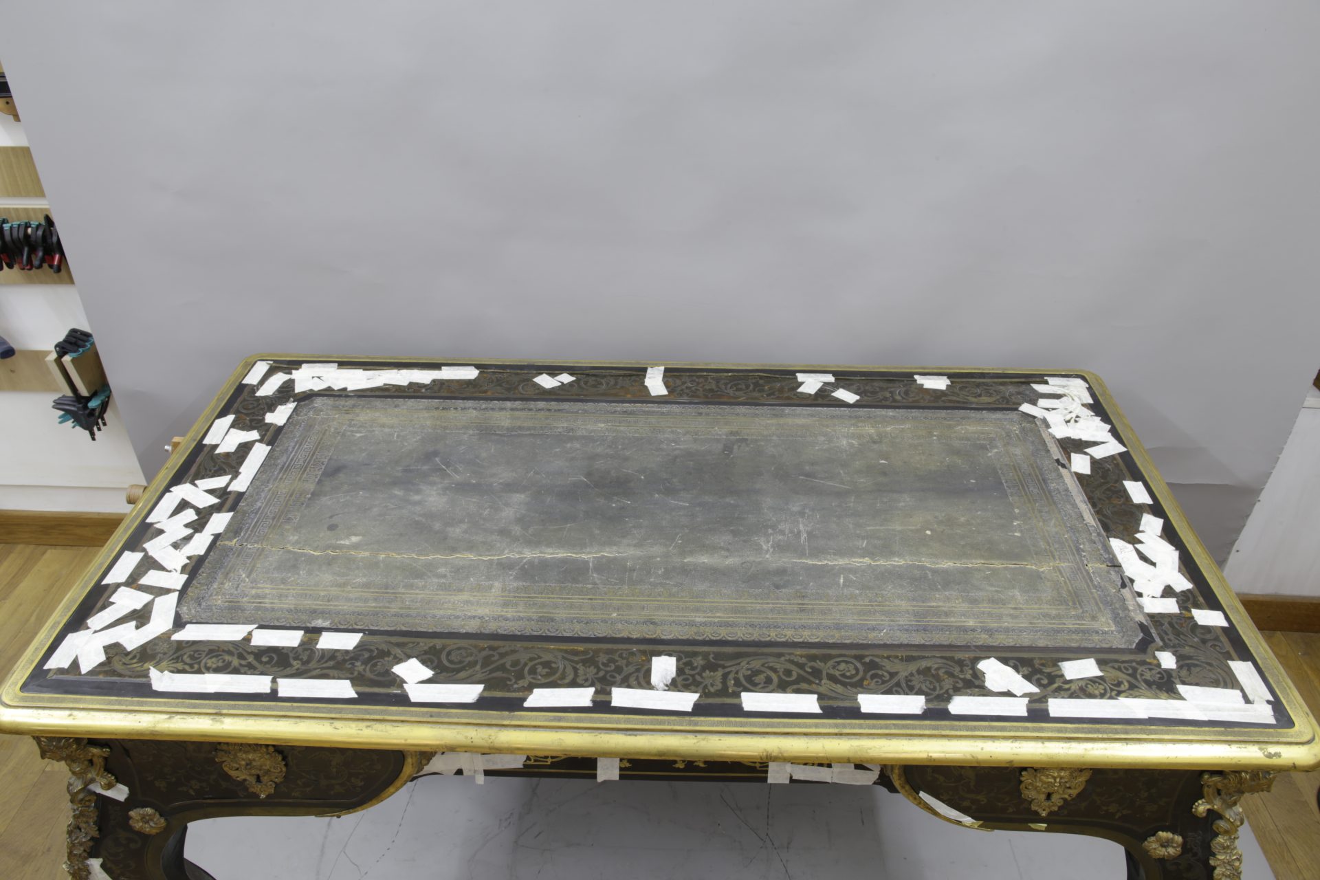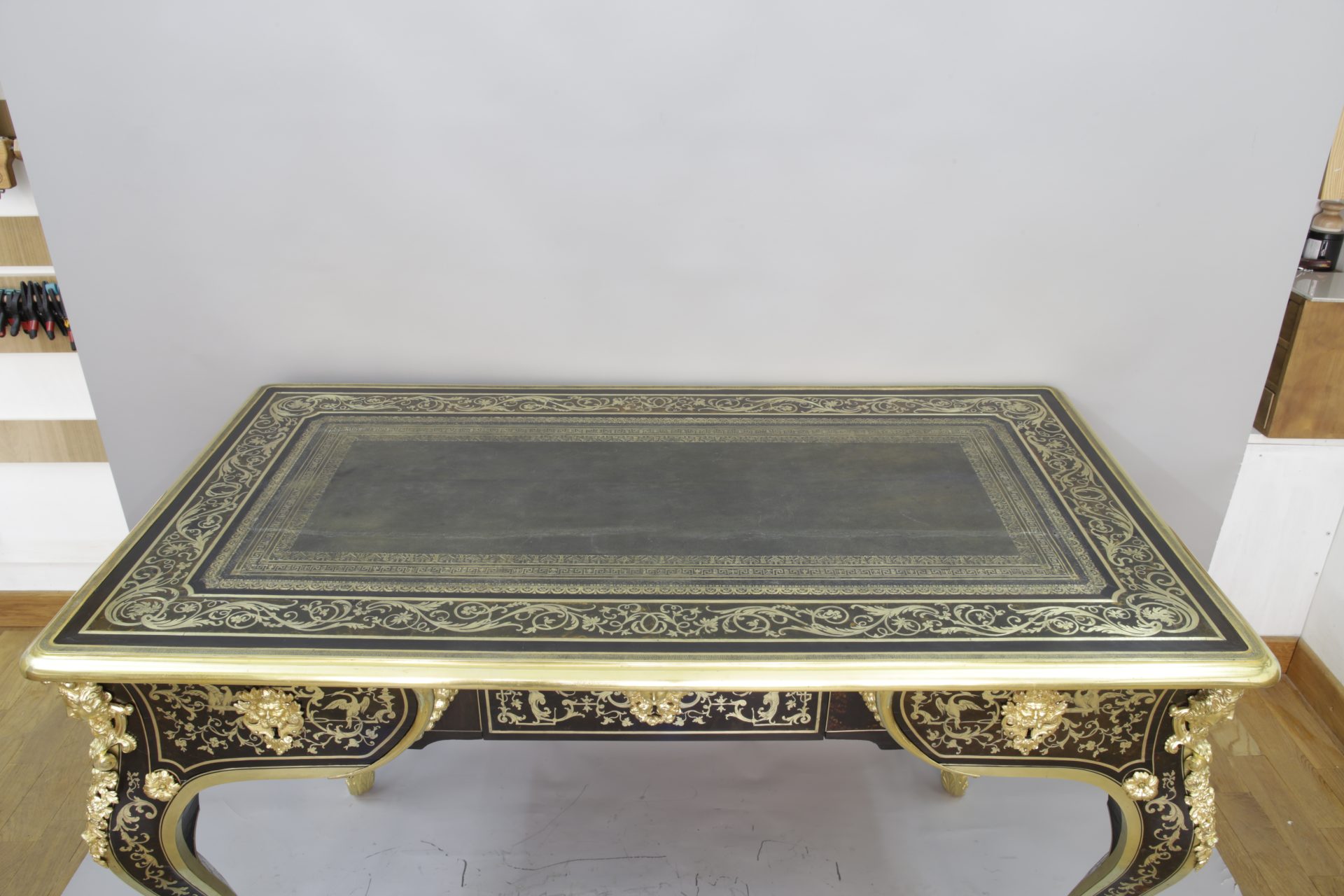 Attribué à Bernard Ier Van Riesen Burgh (1670-1738)Bâti en bois, marqueterie de bois d’ébène, écaille, laiton, cuir et bronzes dorés.Vers 1710-1715H. 81 cm ; L. 133 cm ; P. 91 cmInv. GR 813, dépôt du Musée des Arts décoratifs de Paris