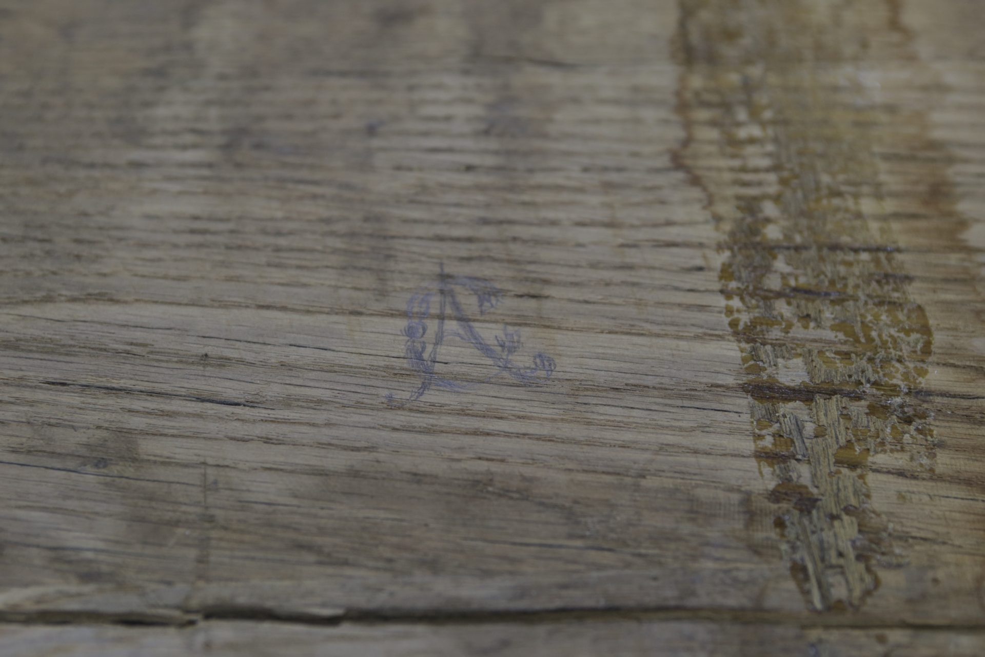 Le constat d’état a permis de mieux comprendre la structure du meuble, d’en identifier les essences de bois et de repérer les éléments postérieurs à sa création. Ont également été identifiées différentes marques, dont un monogramme « AC », tracé au crayon au revers du plateau. Ouvragé, il semble dater de la fabrication du plateau.