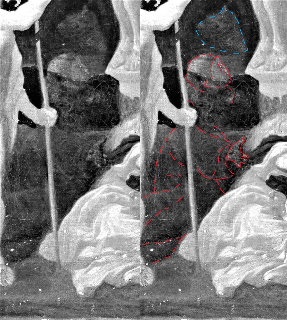 Un dossier d’imagerie scientifique a été réalisé avant l’intervention de restauration afin d’étudier le repeint masquant aujourd’hui le cinquième personnage de la composition placé entre saint Jean Baptiste et Marie Madeleine. On devinait déjà une silhouette d’homme accroupi, mais des détails supplémentaires ont pu être observés. Ainsi, la main du saint apparaît sur le dos de Marie-Madeleine, le pli de la manche et le vêtement sont facilement identifiables, et les contours du visage permettent de comprendre que le regard du saint était orienté vers le Christ. La présence de ce personnage, saint François, est cohérente avec la description que Nivelon donne du tableau pour le Grand Maître de l’Ordre de Malte.