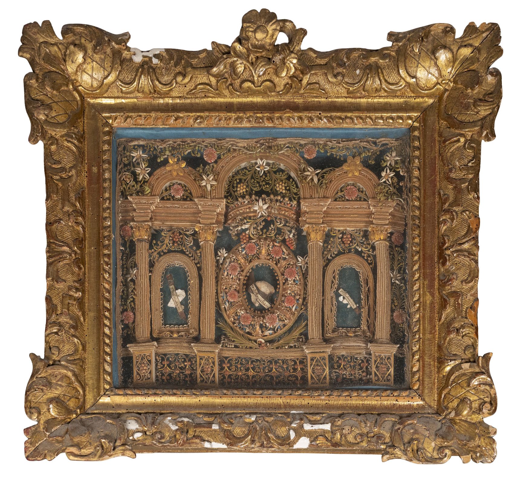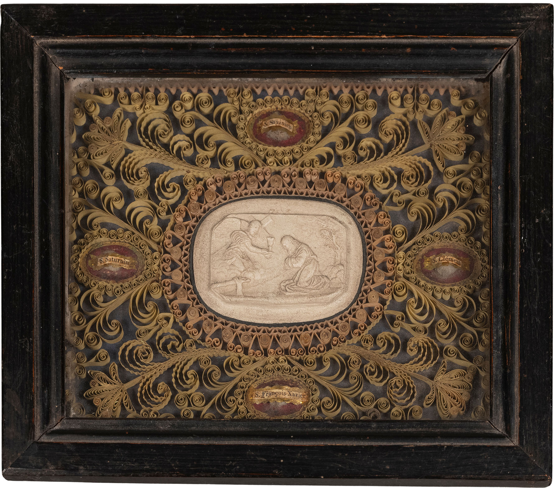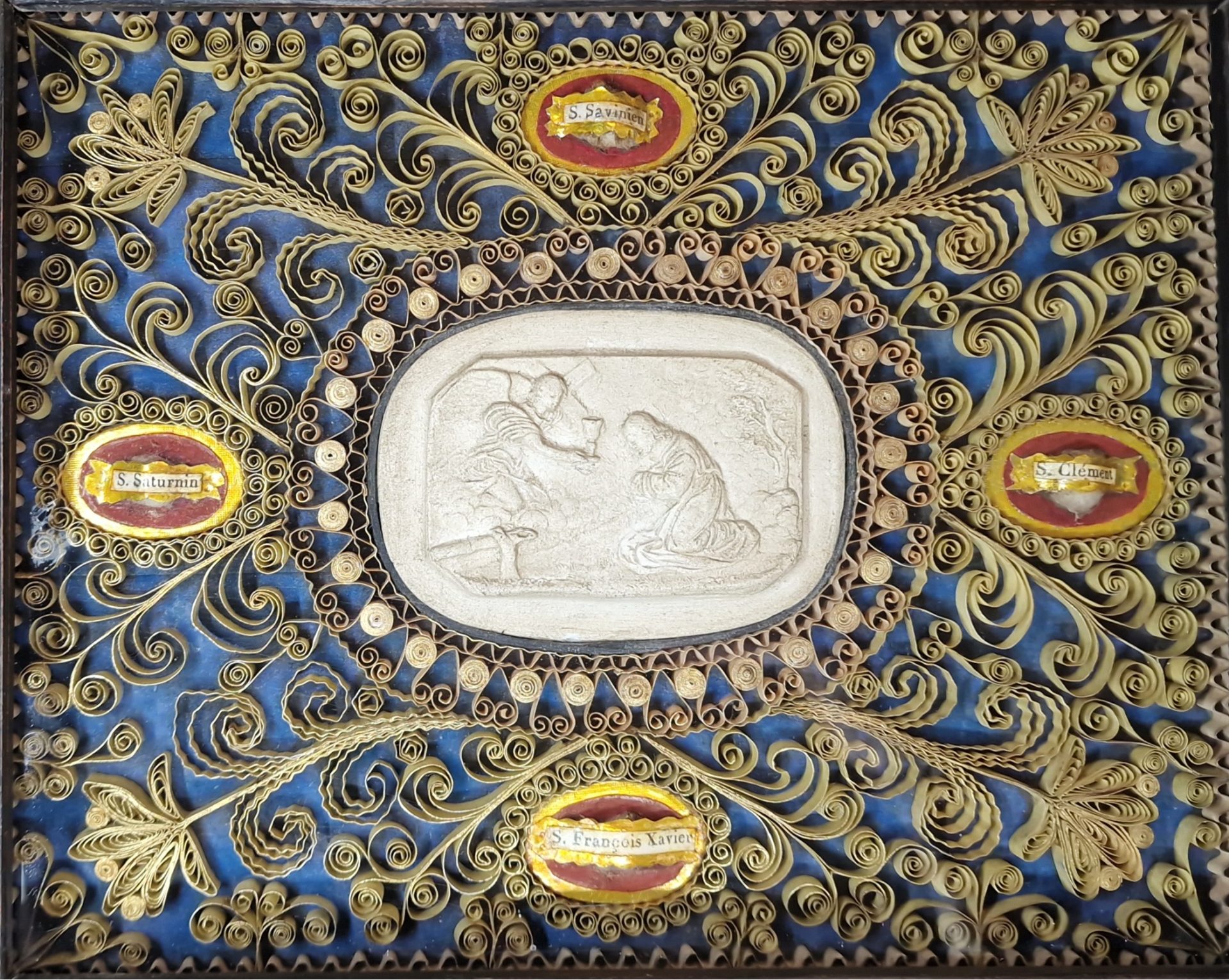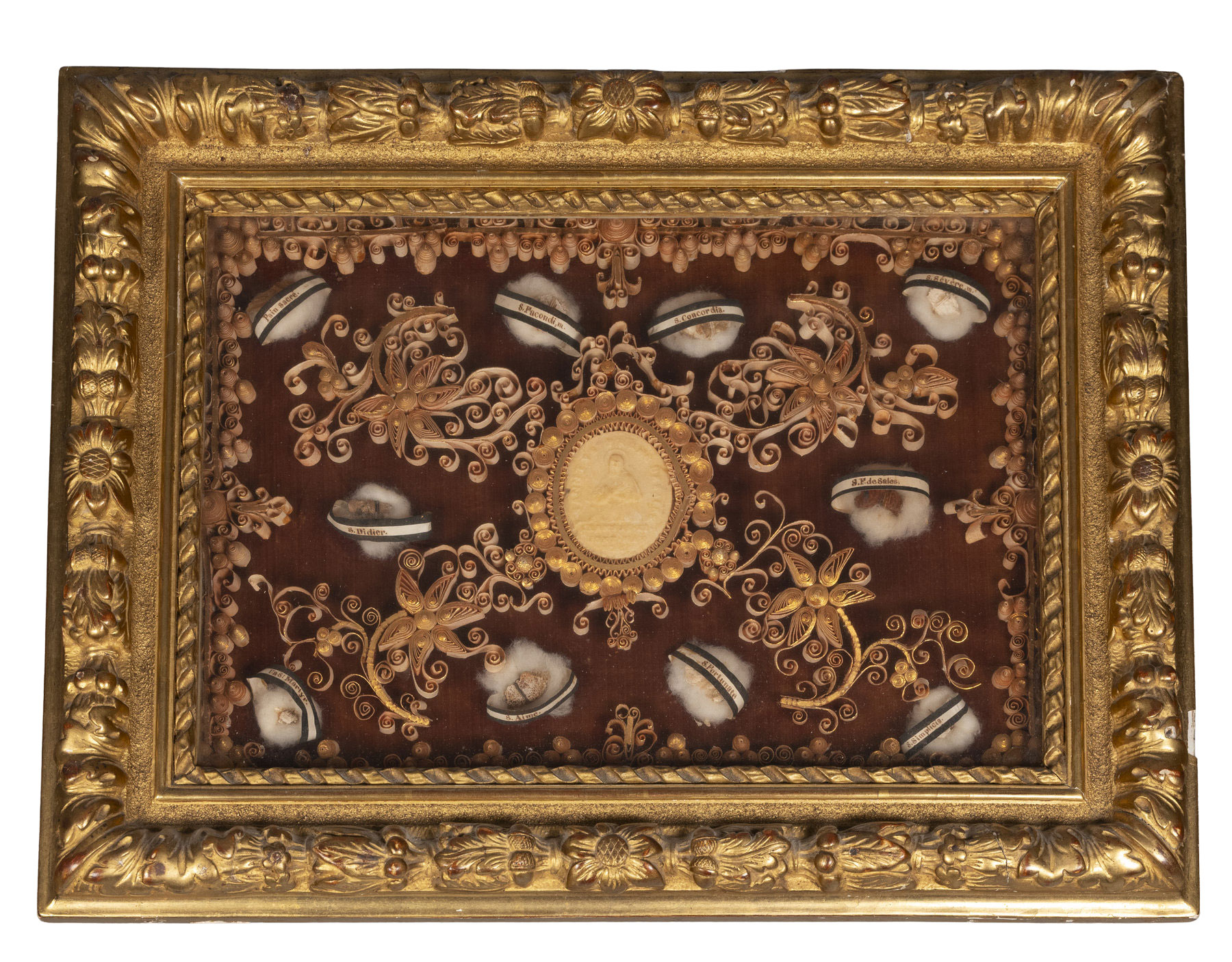 Ordre de la Visitation de Sainte-Marie, Reliquaire avec médaillon de saint François de Sales, début du XVIIIe siècle ?, papier doré, coton et os ?, H. 30,9 cm ; L. 40,4 cm, avant restauration. Département des Hauts-de-Seine, donation Catherine et Gérard Monthel, musée du Grand Siècle, inv.2025.7.771 © CD92 / Julien Garraud
