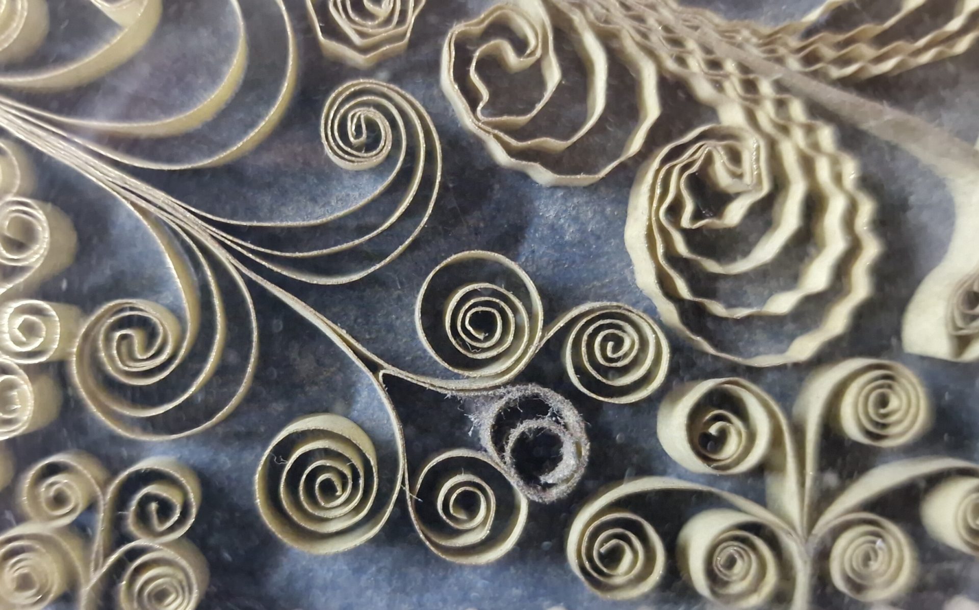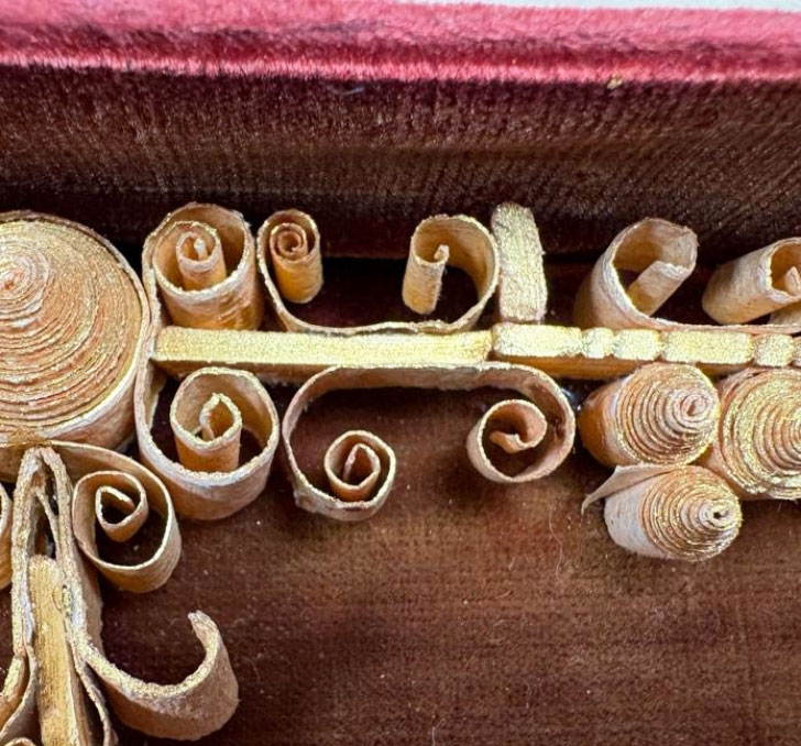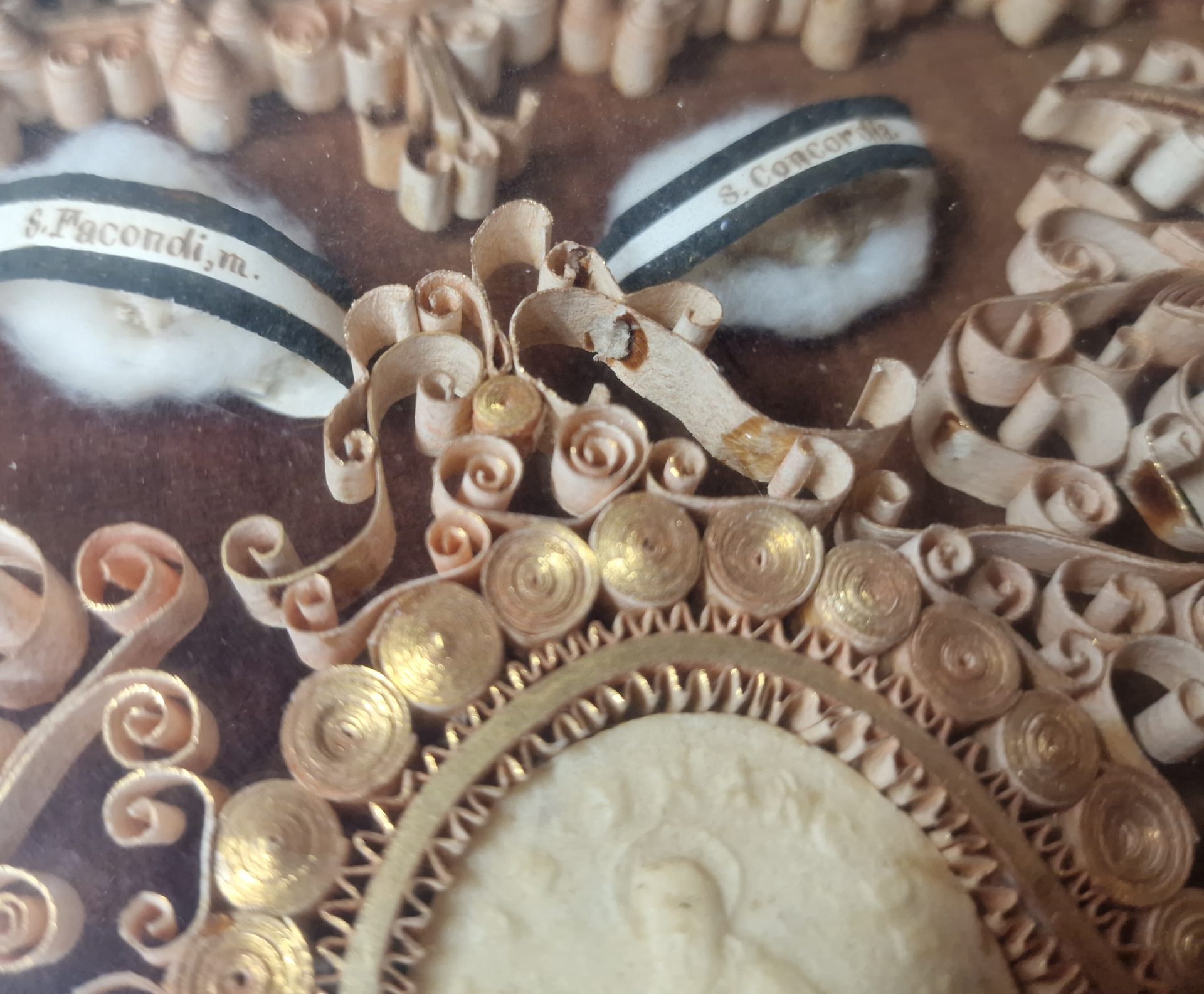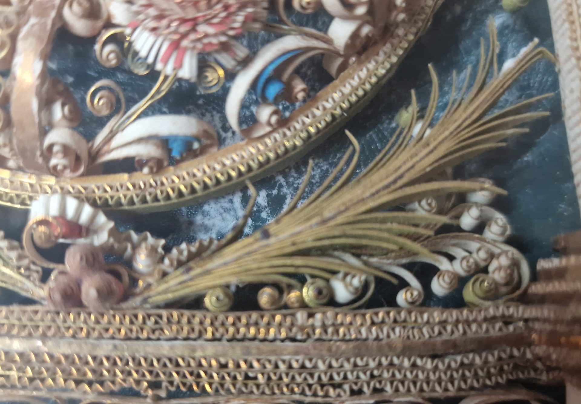 Ordre de la Visitation de Sainte-Marie, Reliquaire avec médaillon de la Vierge, détail d’empoussièrement des bandes de papier © Pernelle Polpré et Astrid Gonnon