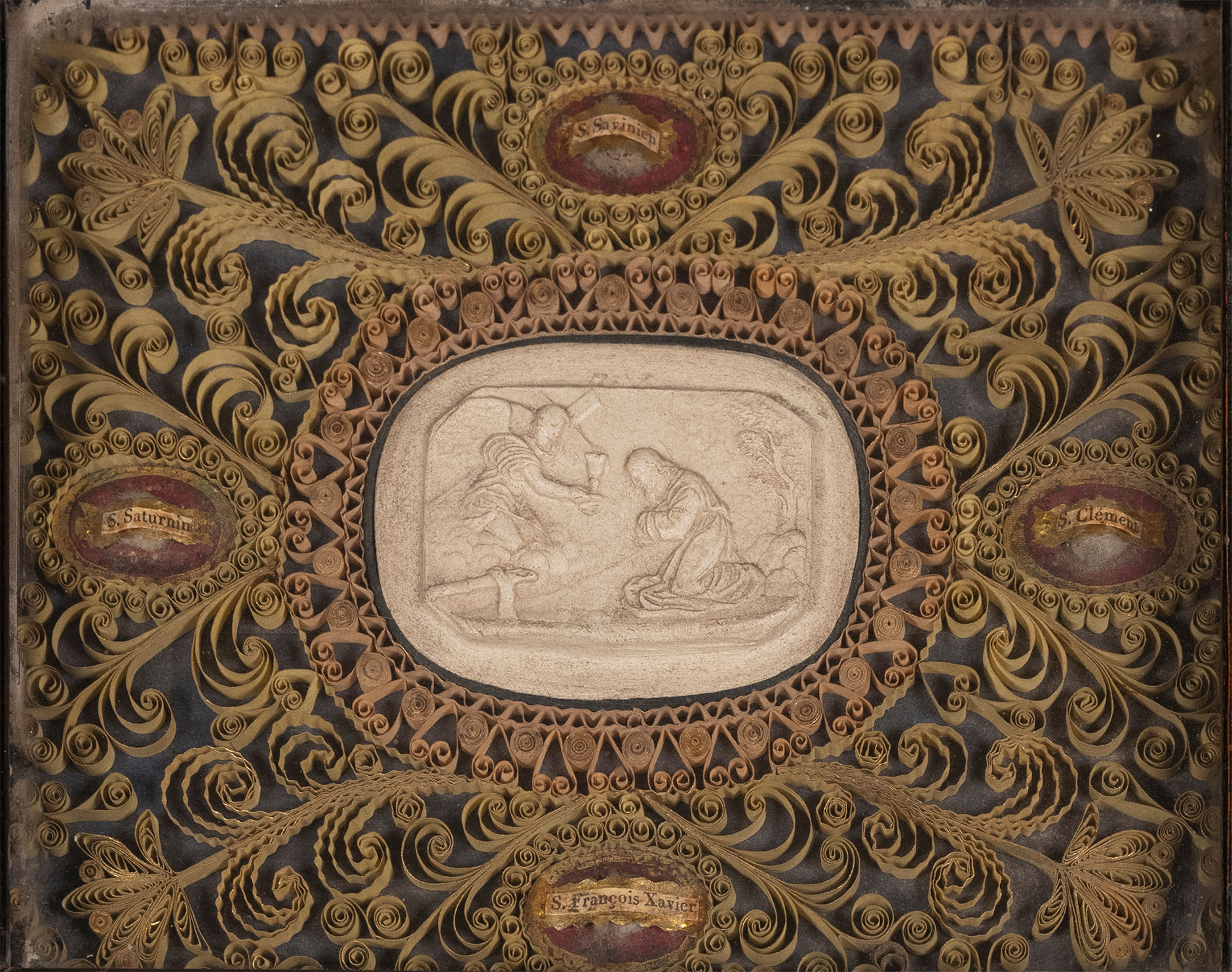 Ordre de la Visitation de Sainte-Marie, Reliquaire avec médaillon du Christ au mont des Oliviers, début du XVIIIe siècle ?, papier doré, bois doré, coton et os ?, H. 30,9 cm ; L. 40,4 cm, avant restauration. Département des Hauts-de-Seine, donation Catherine et Gérard Monthel, musée du Grand Siècle, inv.2025.7.769 © CD92 / Julien Garraud