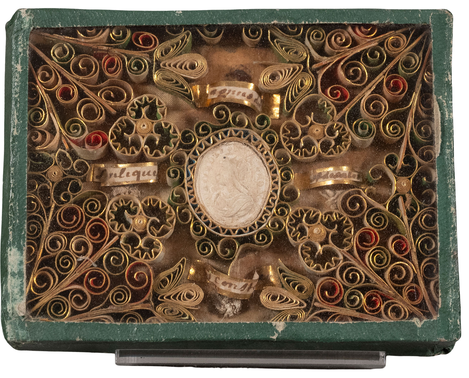Ordre de la Visitation de Sainte-Marie, Reliquaire avec médaillon de la Vierge, début du XVIIIe siècle ?, papier gaufré, papier doré, pierre et os ( ?), H. 7,6 cm ; L. 10,1 cm, avant restauration. Département des Hauts-de-Seine, donation Catherine et Gérard Monthel, musée du Grand Siècle, inv.2025.7.768 © CD92 / Julien Garraud