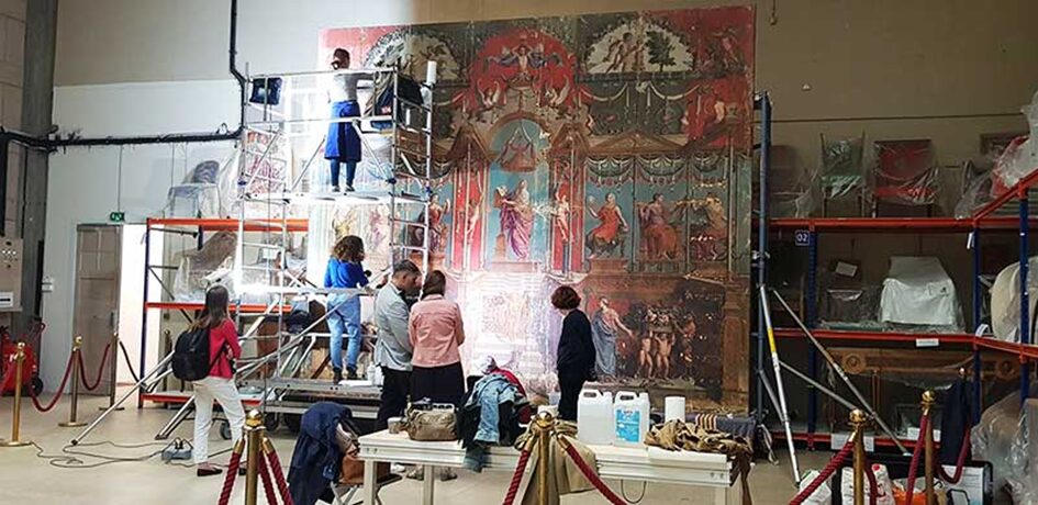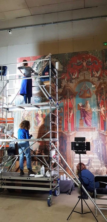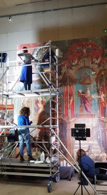 Deux groupements de restaurateurs œuvrent respectivement sur le support et sur la couche picturale. Initié en février 2023, l’intervention fondamentale doit se poursuivre jusqu’à la fin du mois de juillet 2023.