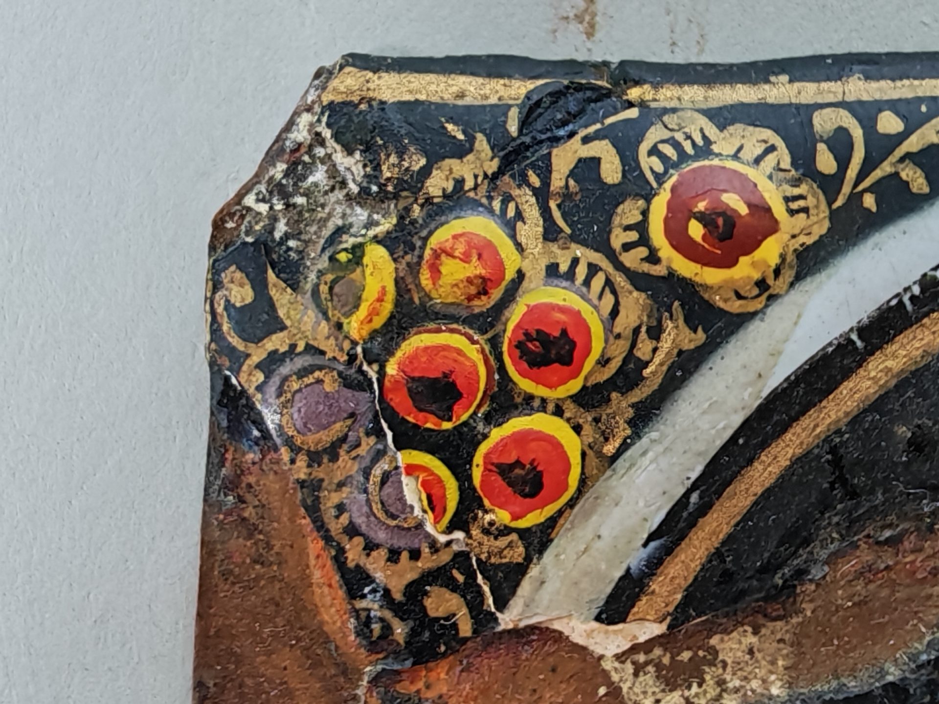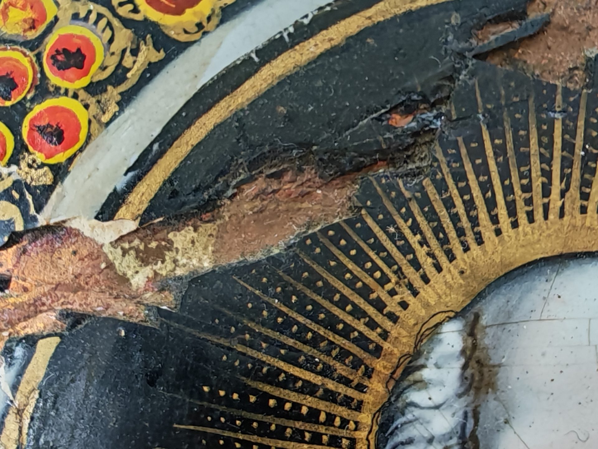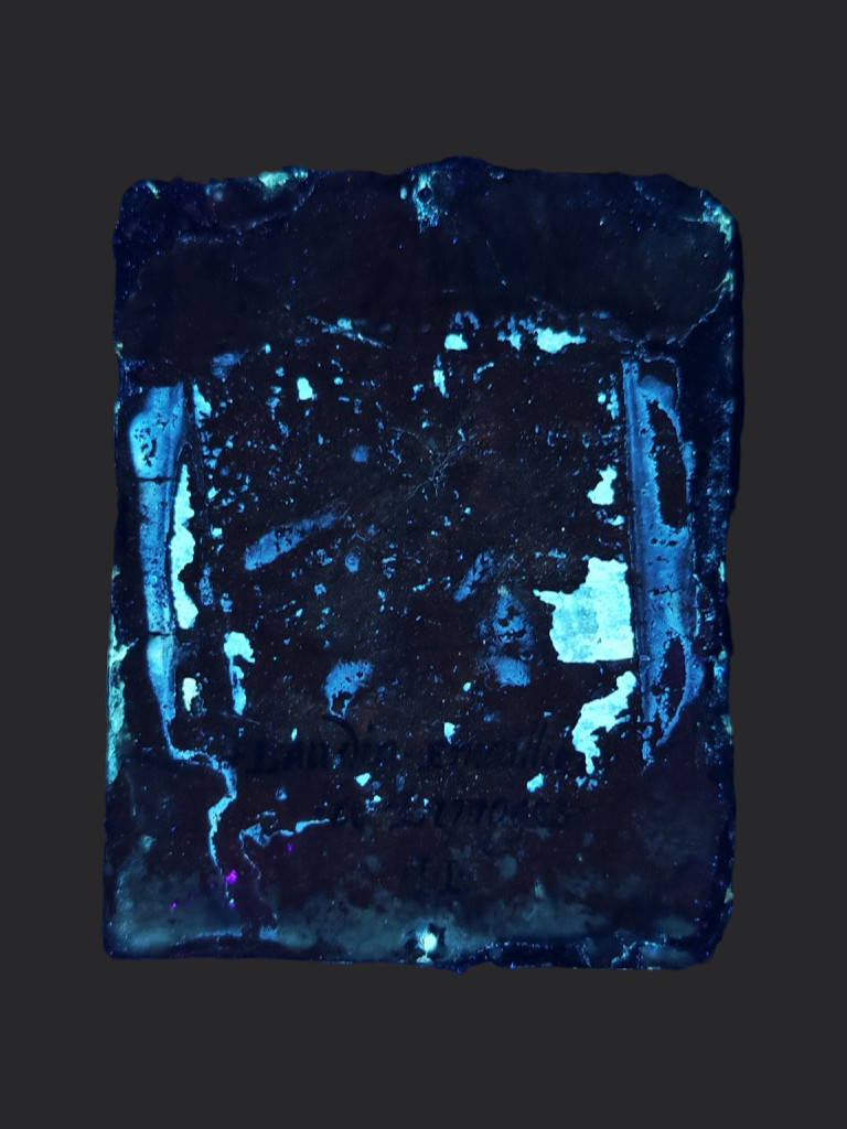 L’examen sous rayonnements ultra-violets a montré la présence de restaurations anciennes en résine sur tout le décor encadrant le médaillon et à droite du visage de saint François de Sales, ainsi que sur l’émail du revers de la plaque. Les restaurateurs ont pu utiliser des produits acides ou basiques auxquels le verre et le métal sont sensibles, accélérant leur processus de dégradation.