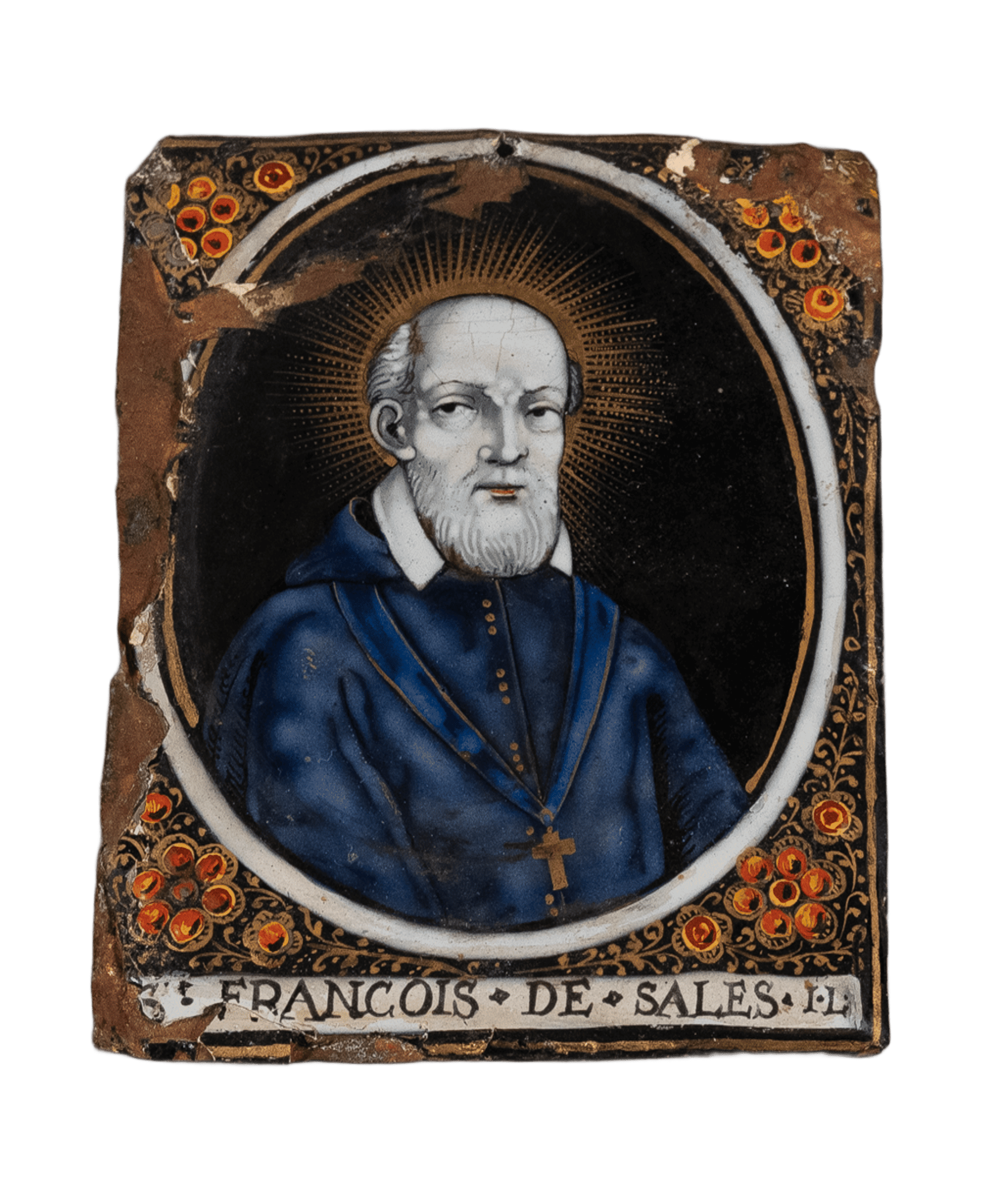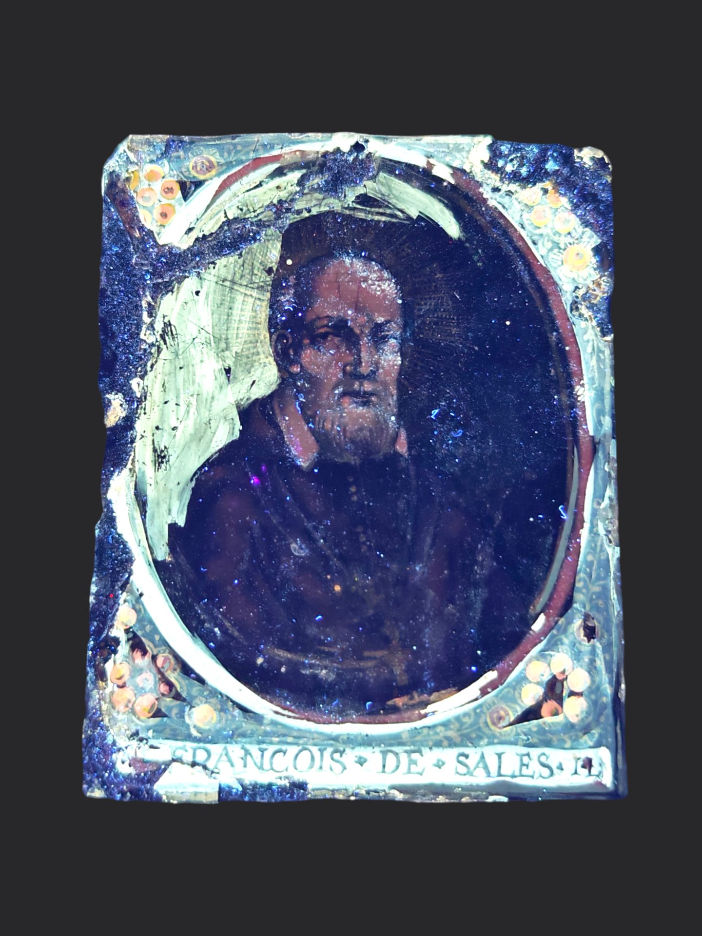 Cette plaque en cuivre émaillée, représentant saint François de Sales, peinte dans l’atelier de Jacques II Laudin (1663-1729), a été restaurée en 2025. Agathe Petit est intervenue sur le support et la couche émaillée.