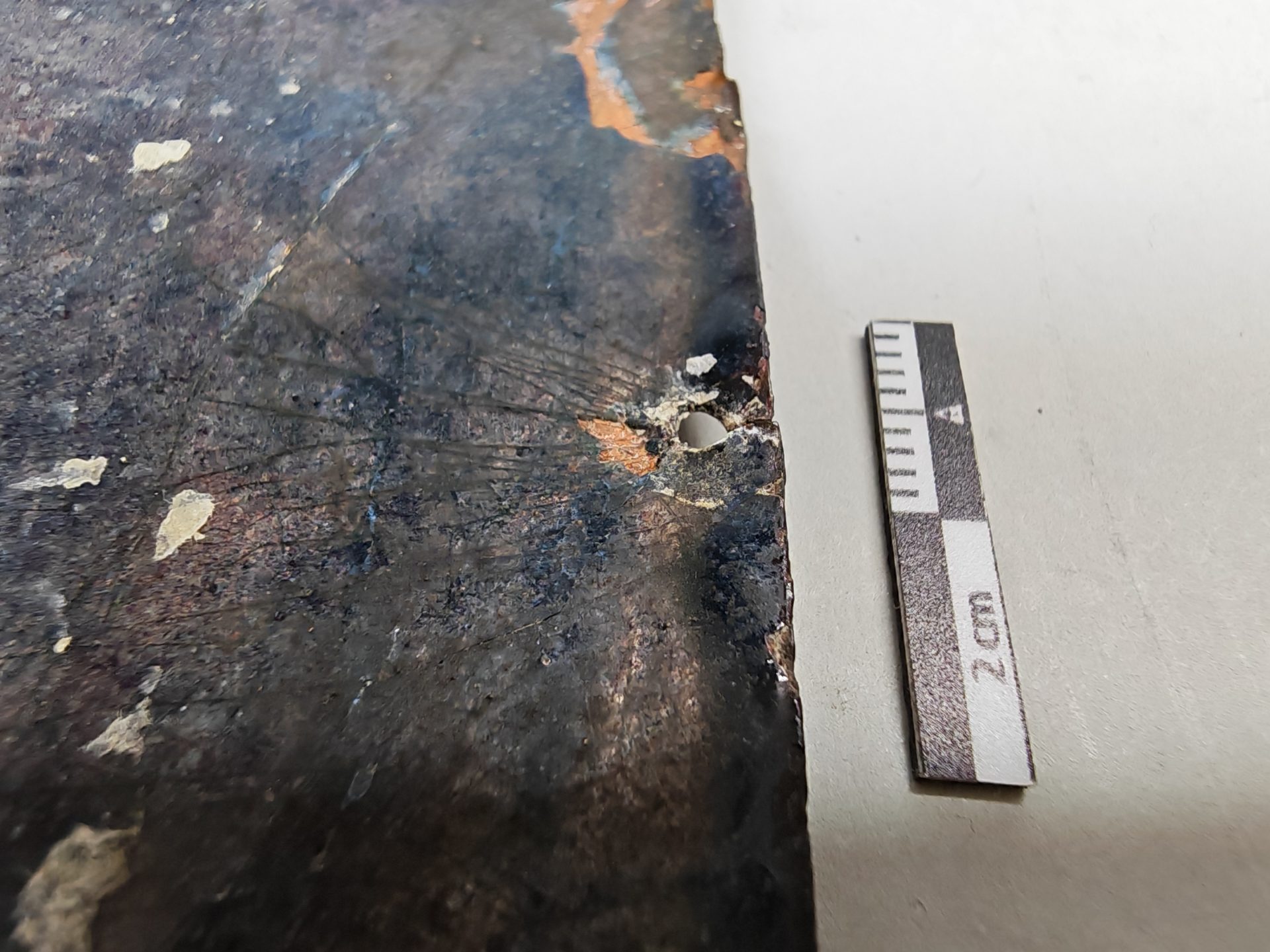 Le dépoussiérage a été réalisé à l’aide d’un pinceau doux en poils de chèvre. Les surfaces vitreuses saines ont été nettoyées à l’aide d’une solution d’eau déminéralisée et d’éthanol. Les produits de corrosion du cuivre ont été éliminés à l’aide d’une lame de scalpel.