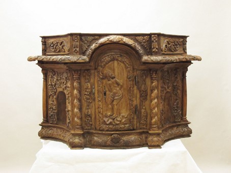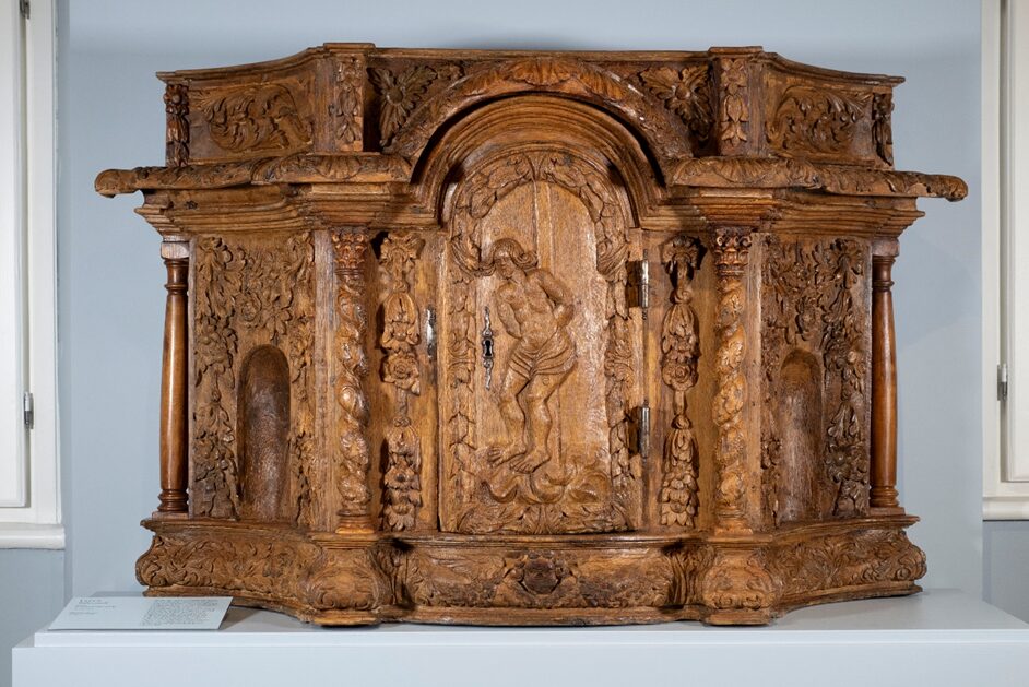 Le tabernacle est un meuble qui contient les hosties consacrées (réserve eucharistique). Il est, depuis la Réforme catholique, disposé en évidence sur l’autel majeur des églises.Acquis en vente publique en 2022, ce tabernacle est construit en bois massif. Il ouvre en façade par une porte cintrée sur laquelle est sculpté en relief un Christ à la Colonne. Ce thème, rare dans l’iconographie, s’inscrit dans la Réforme catholique qui met en avant le Sacrifice et la présence réelle du Christ dans le Saint-Sacrement. En effet, la réaffirmation du dogme catholique en réaction à la Réforme protestante, engendre au XVIIe siècle l’habitude de placer la réserve eucharistique en évidence au centre de l’autel. Dans ce contexte, les tabernacles se multiplient et prennent de l’ampleur.Cet exemplaire témoigne d’un travail régional de bonne qualité. Il est très représentatif de la production courante réalisée pour les églises du territoire.Au moment de son acquisition, cet objet présentait un état de surface hétérogène. Il était fortement encrassé, ce qui nuisait à son aspect. L’opération de restauration a consisté en un nettoyage soigné, qui a redonné de la cohérence à l’ensemble et permet désormais de mieux apprécier la finesse de ses décors sculptés.