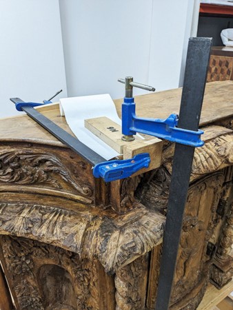 Recollage d’éléments désolidarisés. Atelier anonyme français, Tabernacle en cours de restauration, seconde moitié du XVIIe siècle, chêne massif sculpté, H. 84 x L. 141 x P. 128 cm, Département des Hauts-de-Seine, musée du Grand Siècle, inv. 2022.14.1 © Sylvain Lucchetta