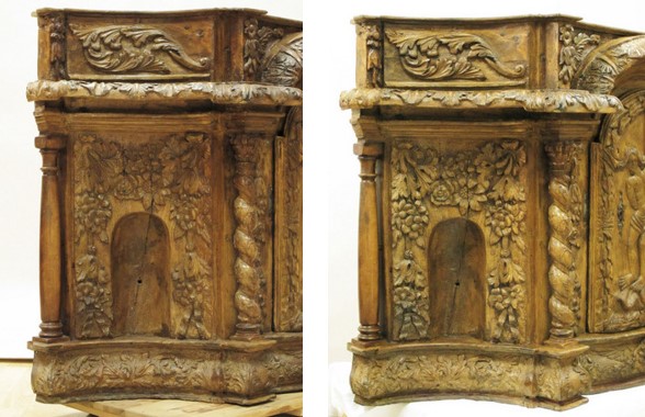 Détail avant et après restauration. Atelier anonyme français, Tabernacle, seconde moitié du XVIIe siècle, chêne massif sculpté, H. 84 x L. 141 x P. 128 cm, Département des Hauts-de-Seine, musée du Grand Siècle, inv. 2022.14.1 © Sylvain Lucchetta