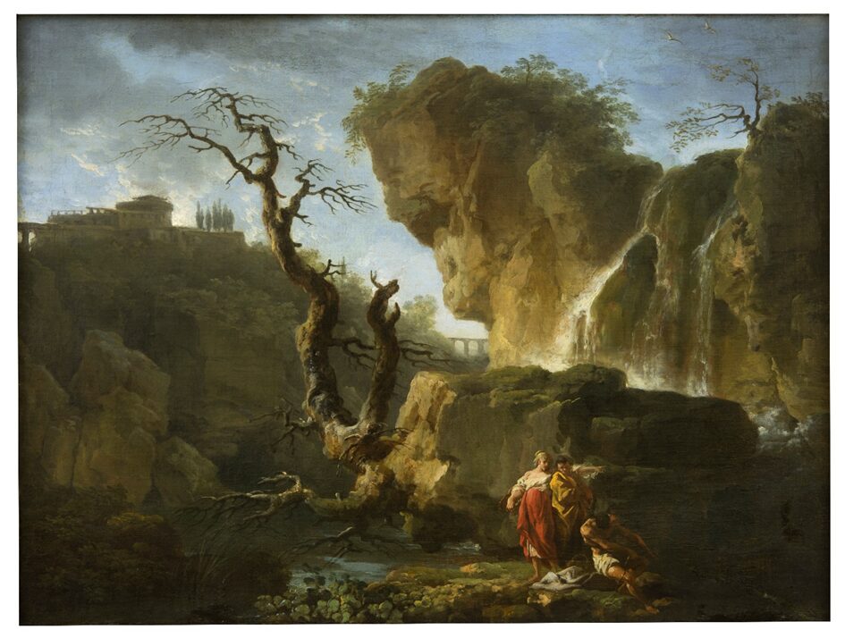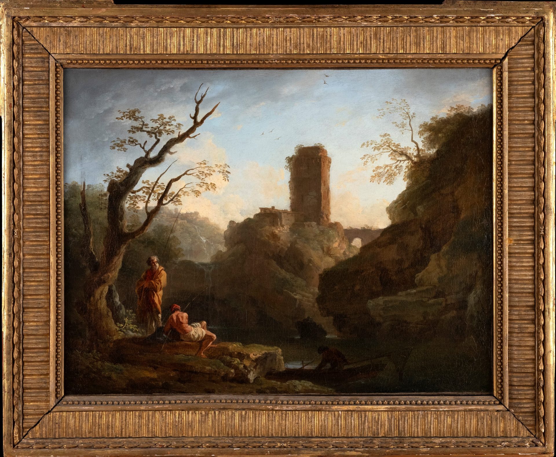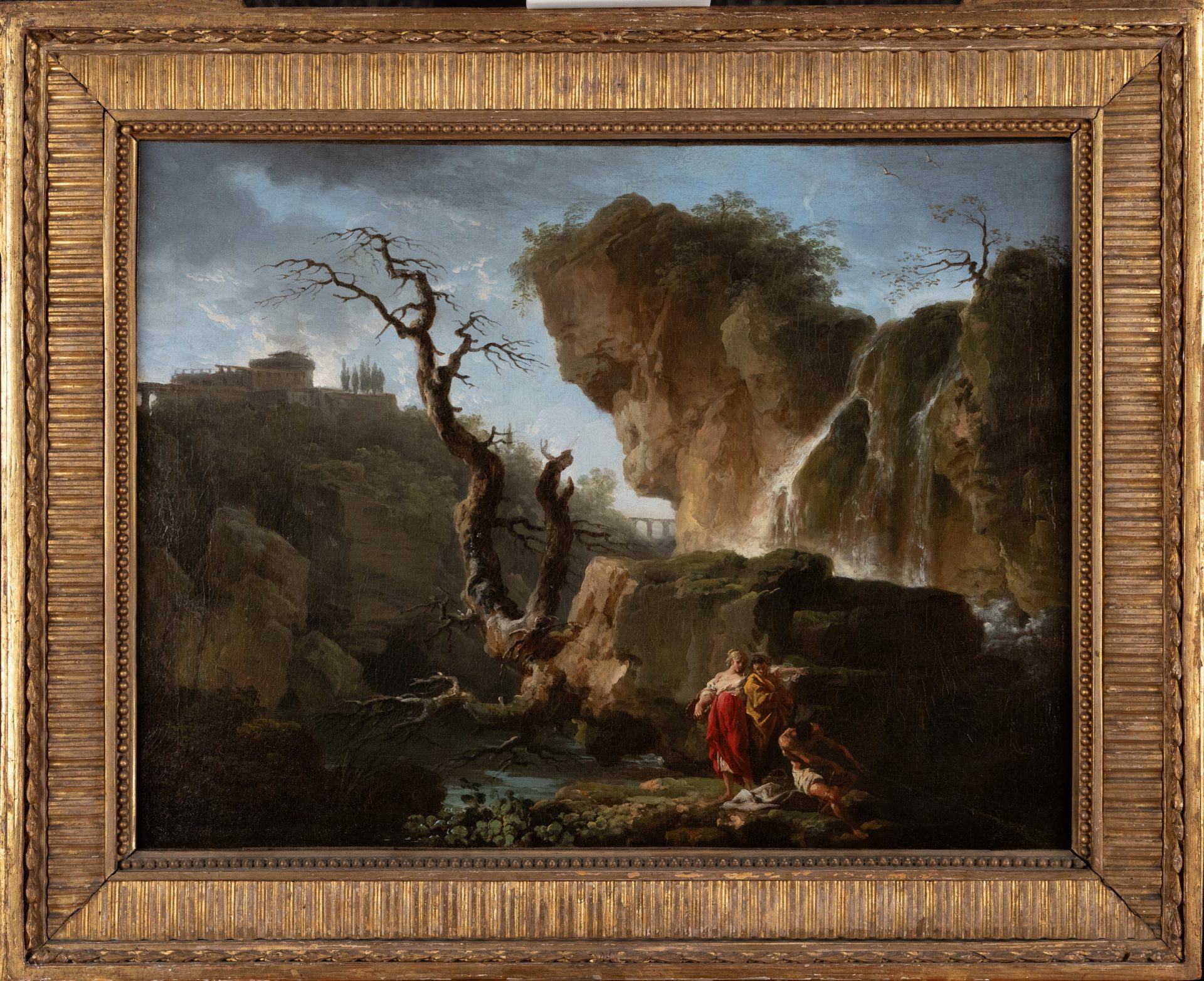 Joseph Vernet livre ici deux paysages imaginaires de dimensions réduites, fruits d’un travail de recomposition en atelier. Il emploie des motifs issus de plusieurs œuvres qu’il transforme de manière poétique. Héritier de la tradition du paysage français et italien, il opère une synthèse entre Nicolas Poussin, Claude Lorrain, Locatelli et Panini. Vernet structure l’espace par des masses rocheuses, tout en inondant l’ensemble d’effets d’atmosphère et d’une lumière douce. Originaire d’Avignon, l’artiste se rend en Italie de 1734 à 1752, d’abord à Rome, puis à Naples, où il peint des marines et dessine sur le motif. Célèbre dans toute l’Europe pour ses paysages classiques et idéalisés, il est particulièrement connu pour la série des « ports de France » commandée par Louis XV.